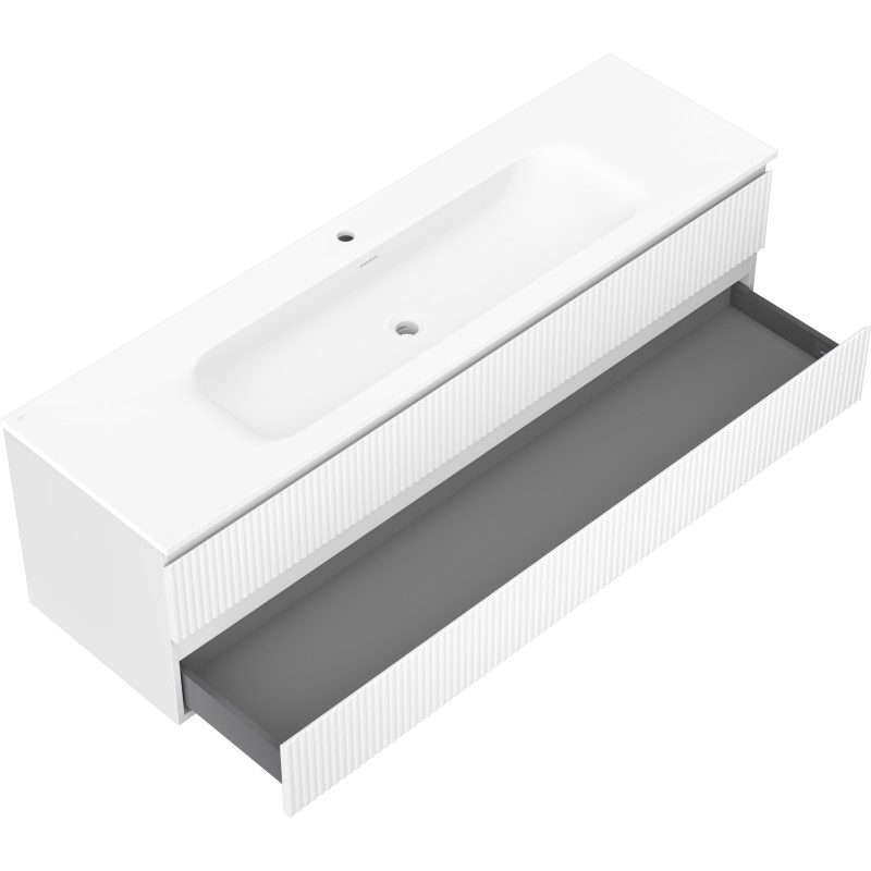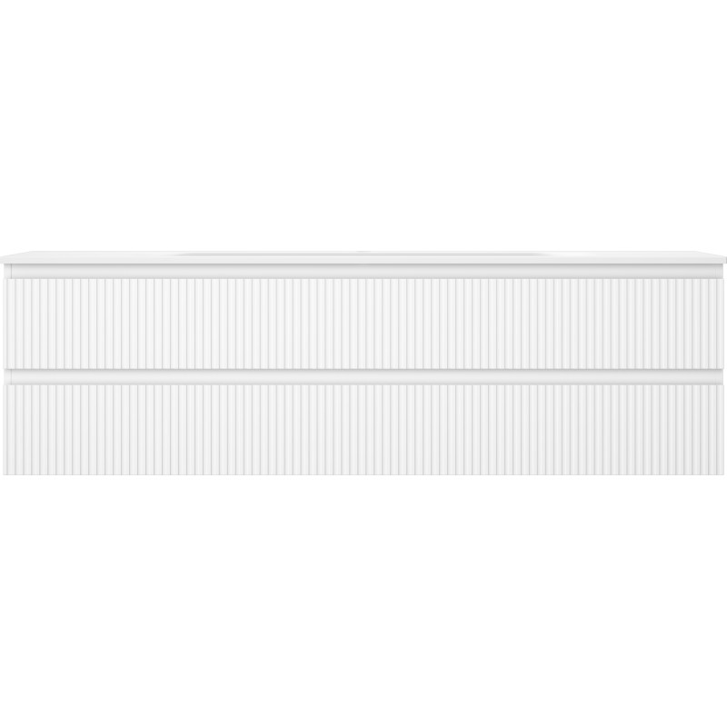 Špecifikácia produktu: Rozmery skrinky: Šírka: 160 cm Hĺbka: 46 cm Výška: 47 cm Farba korpusu: Matná biela Materiál korpusu: Lakovaná doska Farba čela: Matná biela Materiál čela: Lakovaná MDF doska Štruktúra čela: Drážkovaná Počet zásuviek: Povrch odolný voči UV žiareniu Rozmery umývadla: Šírka: 161 cm Hĺbka: 46,5 cm Výška: 16,5 cm Farba umývadla: Matná biela Materiál umývadla: Konglomerát Otvor na prepad: Áno Otvor na batériu: Áno Zmontovaný výrobok