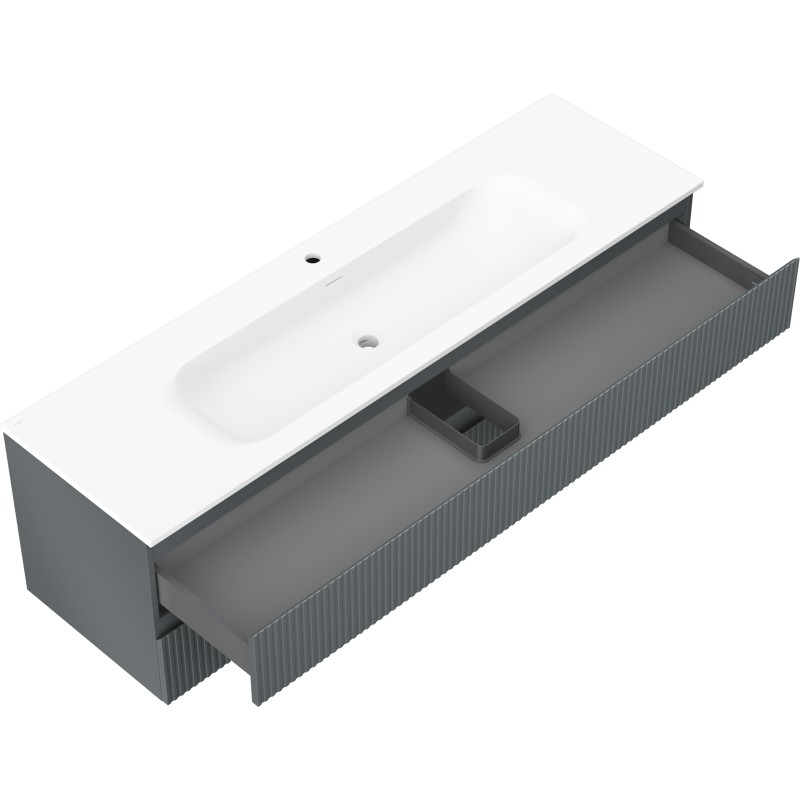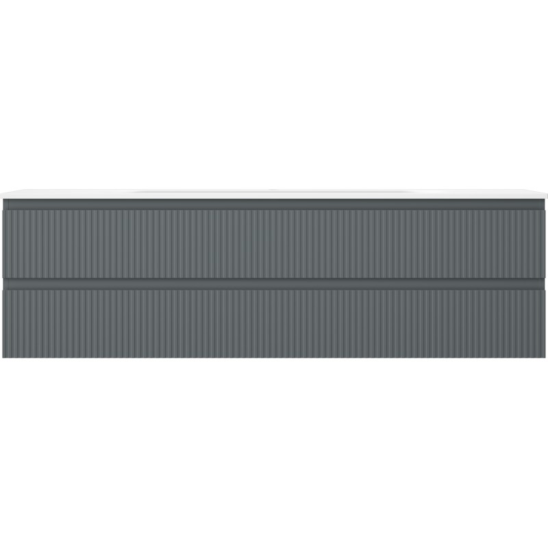 Špecifikácia produktu: Rozmery skrinky: Šírka: 160 cm Hĺbka: 46 cm Výška: 47 cm Farba korpusu: Matný grafit Materiál korpusu: Lakovaná doska Farba čela: Matný grafit Materiál čela: Lakovaná MDF doska Štruktúra čela: Drážkovaná Počet zásuviek: Povrch odolný voči UV žiareniu Rozmery umývadla: Šírka: 161 cm Hĺbka: 46,5 cm Výška: 16,5 cm Farba umývadla: Matná biela Materiál umývadla: Konglomerát Otvor na prepad: Áno Otvor na batériu: Áno Zmontovaný výrobok