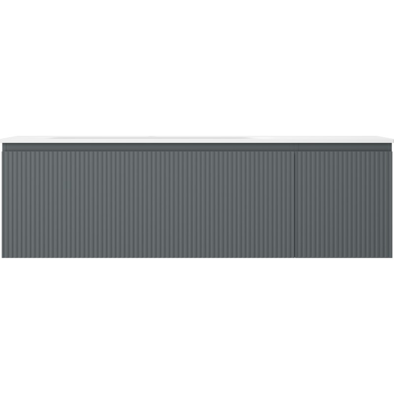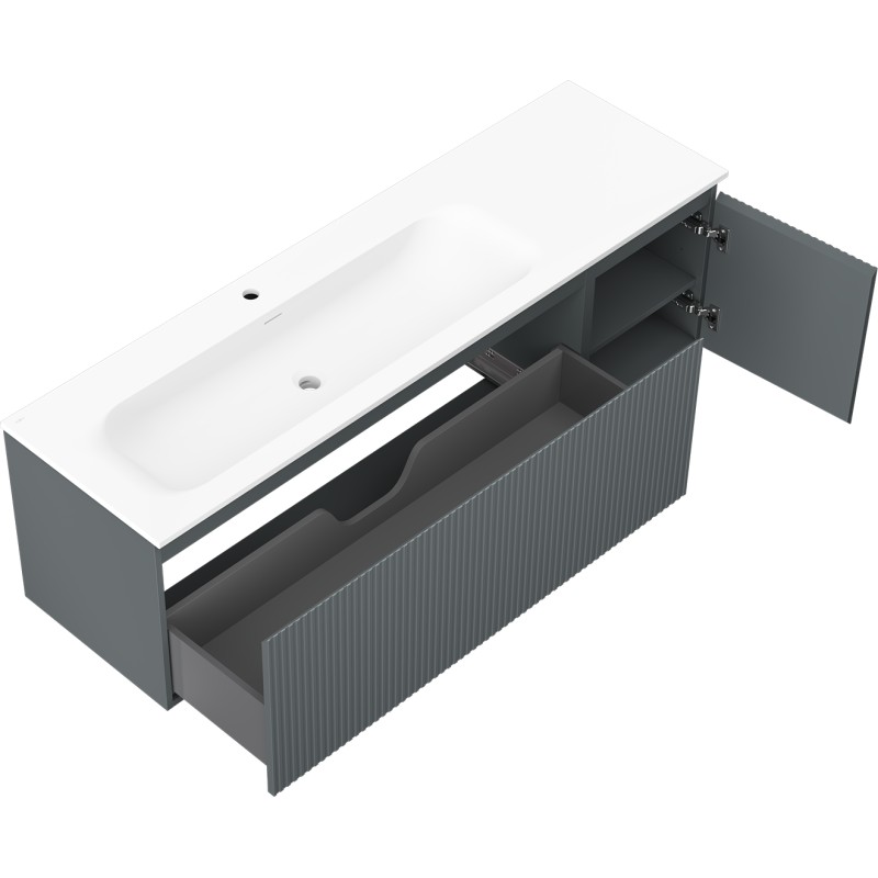 Špecifikácia produktu: Rozmery skrinky: Šírka: 160 cm Hĺbka: 46 cm Výška: 47 cm Sada obsahuje: Zásuvková skrinka pod umývadlo: Šírka: 120 cm Hĺbka: 46 cm Výška: 47 cm Farba korpusu Matný grafit Materiál čela: Lakovaná MDF doska Konštrukcia čela: Drážkovaná Počet zásuviek: 1 Priestranná zásuvka s funkciou tlmenia dovierania Povrch odolný voči UV žiareniu Skrinka pod umývadlo s dvierkami: Šírka: 40 cm Výška: 47 cm Hĺbka: 46 cm Farba korusta čela: Matný grafit Materiál čela: Lakovaná MDF doska Konštrukcia čela: Drážkovaná Počet dvierok: 1 1 polica Panty s funkciou tlmenia dovierania Univerzálna montáž dvierok (ľavé/pravé) Povrch odolný voči UV žiareniu Umývadlo: Šírka: 161 cm Hĺbka: umývadlá: Matná biela Materiál umývadla: Konglomerát Otvor pre prepad: Áno Otvor pre batériu: Áno Zmontovaný výrobok