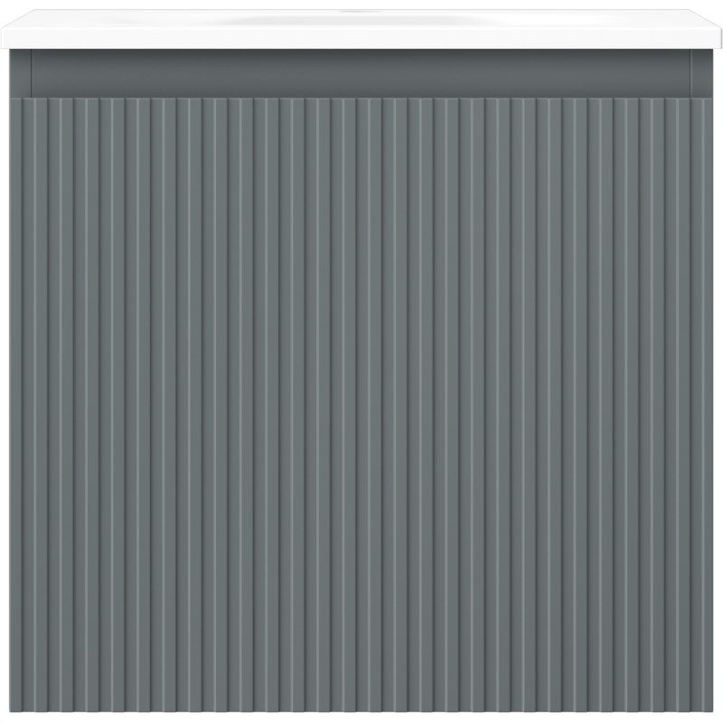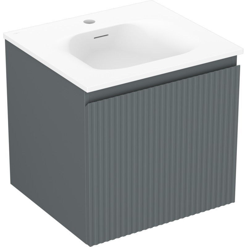 Špecifikácia produktu: Rozmery skrinky: Šírka: 50 cm Hĺbka: 46 cm Výška: 47 cm Farba korpusu: Matný grafit Materiál korpusu: Lakovaná doska Farba čela: Matný grafit Materiál čela: Lakovaná MDF doska Štruktúra čela: Drážkovaná Počet zásuviek: 1 odolný voči UV žiareniu Rozmery umývadla: Šírka: 51 cm Hĺbka: 46,5 cm Výška: 16,5 cm Farba umývadla: Matná biela Materiál umývadla: Konglomerát Otvor pre prepad: Áno Otvor pre batériu: Áno Zmontovaný výrobok