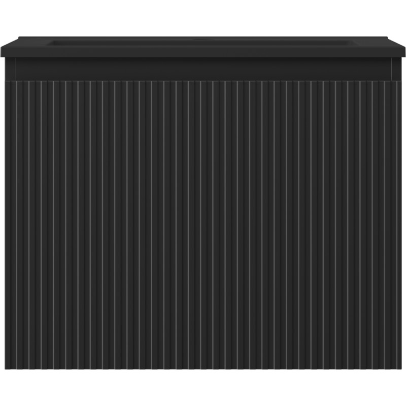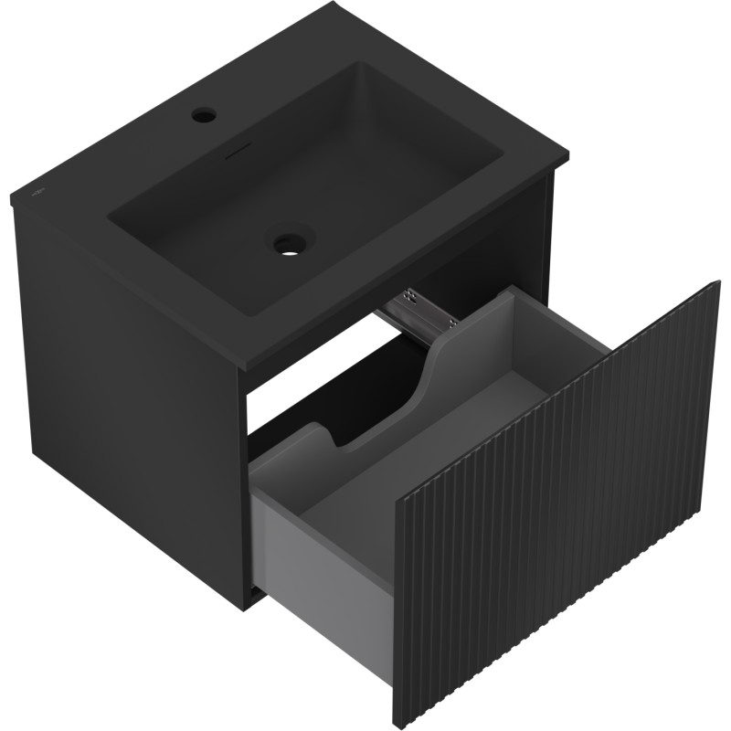 Špecifikácia produktu: Rozmery skrinky: Šírka: 60 cm Hĺbka: 46 cm Výška: 47 cm Farba korpusu: Matná čierna Materiál korpusu: Lakovaná doska Farba čela: Matná čierna Materiál čela: Lakovaná MDF doska Štruktúra čela: Drážkovaná Počet zásuviek: 1 Priestranná žiarenia Rozmery umývadla: Šírka: 61 cm Hĺbka: 46,5 cm Výška: 16,5 cm Farba umývadla: Matná čierna Materiál umývadla: Konglomerát Otvor pre prepad: Áno Otvor pre batériu: Áno Zmontovaný výrobok