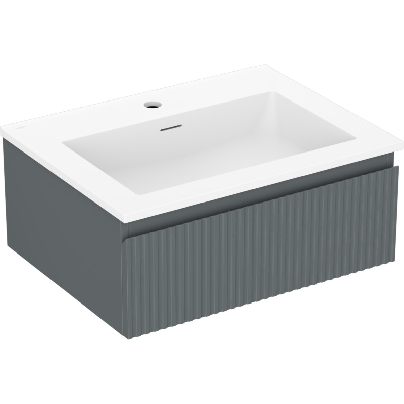 Špecifikácia produktu: Rozmery skrinky: Šírka: 60 cm Hĺbka: 46 cm Výška: 23,5 cm Farba korpusu: Matný grafit Materiál korpusu: Lakovaná doska Farba čela: Matný grafit Materiál čela: Lakovaná MDF doska Štruktúra čela: Drážkovaná Počet zásuviek: Povrch odolný voči UV žiareniu Rozmery umývadla: Šírka: 61 cm Hĺbka: 46,5 cm Výška: 16,5 cm Farba umývadla: Matná biela Materiál umývadla: Konglomerát Otvor pre prepad: Áno Otvor pre batériu: Áno Zmontovaný výrobok