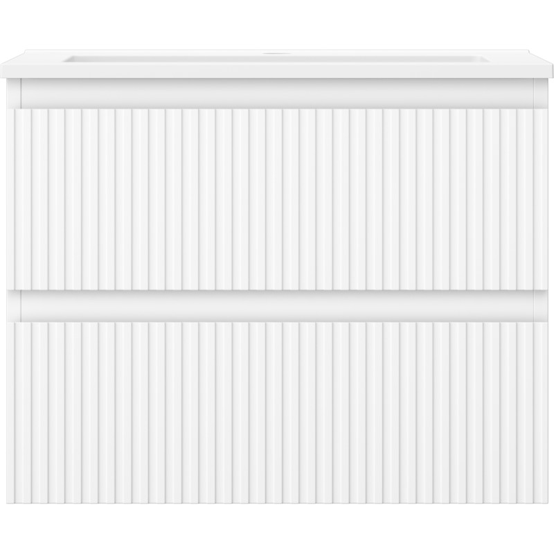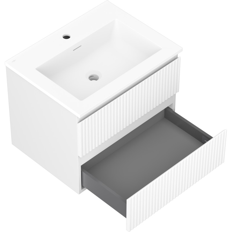 Špecifikácia produktu: Rozmery skrinky: Šírka: 60 cm Hĺbka: 46 cm Výška: 47 cm Farba korpusu: Matná biela Materiál korpusu: Lakovaná doska Farba čela: Matná biela Materiál čela: Lakovaná MDF doska Štruktúra čela: Drážkovaná Počet zásuviek: 2 odolný voči UV žiareniu Rozmery umývadla: Šírka: 61 cm Hĺbka: 46,5 cm Výška: 16,8 cm Farba umývadla: Matná biela Materiál umývadla: Konglomerát Otvor pre prepad: Áno Otvor pre batériu: Áno Zmontovaný výrobok