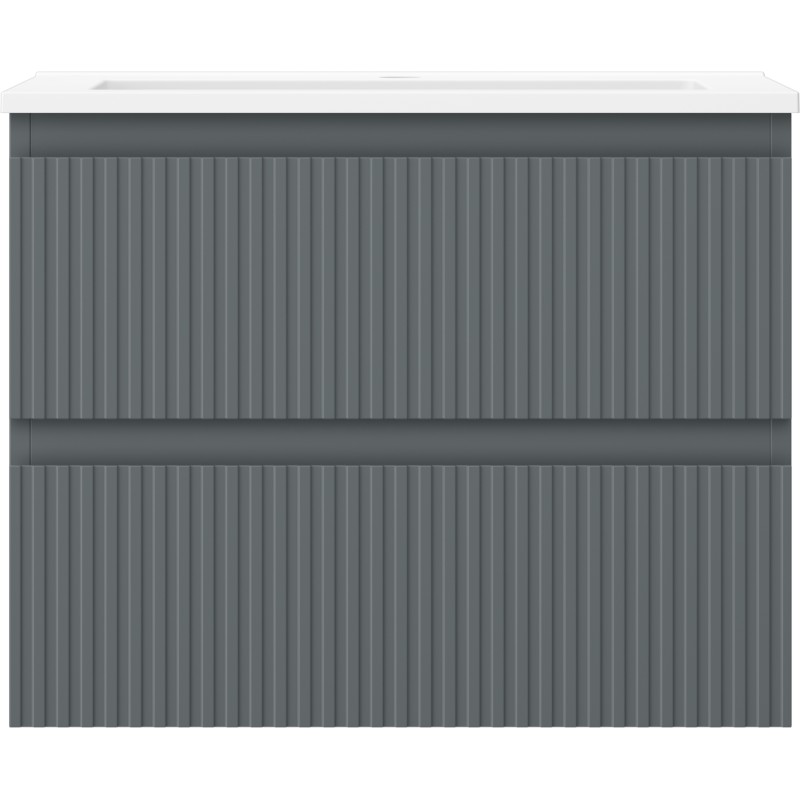 Špecifikácia produktu: Rozmery skrinky: Šírka: 60 cm Hĺbka: 46 cm Výška: 47 cm Farba korpusu: Matný grafit Materiál korpusu: Lakovaná doska Farba čela: Matný grafit Materiál čela: Lakovaná MDF doska Štruktúra čela: Drážkovaná Počet zásuviek: 2 odolný voči UV žiareniu Rozmery umývadla: Šírka: 61 cm Hĺbka: 46,5 cm Výška: 16,5 cm Farba umývadla: Matná biela Materiál umývadla: Konglomerát Otvor pre prepad: Áno Otvor pre batériu: Áno Zmontovaný výrobok