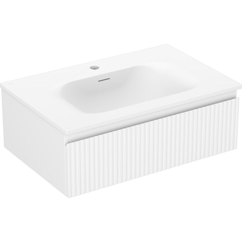 Špecifikácia produktu: Rozmery skrinky: Šírka: 70 cm Hĺbka: 46 cm Výška: 23,5 cm Farba korpusu: Matná biela Materiál korpusu: Lakovaná doska Farba čela: Matná biela Materiál čela: Lakovaná MDF doska Štruktúra čela: Drážkovaná Počet zásuviek: Povrch odolný voči UV žiareniu Rozmery umývadla: Šírka: 71 cm Hĺbka: 46,5 cm Výška: 16,5 cm Farba umývadla: Matná biela Materiál umývadla: Konglomerát Otvor pre prepad: Áno Otvor pre batériu: Áno Zmontovaný výrobok