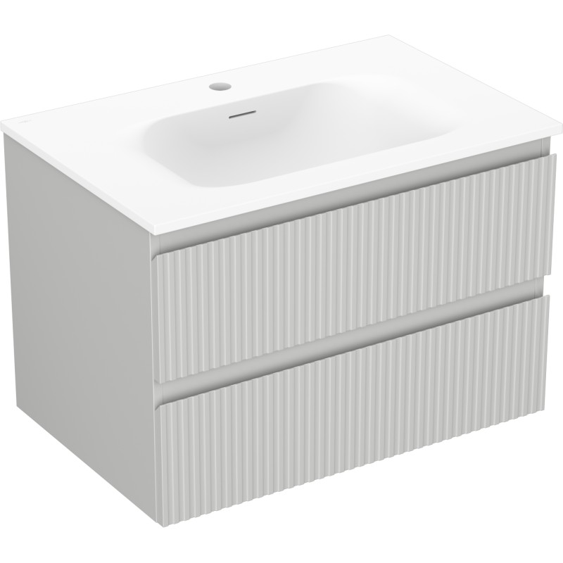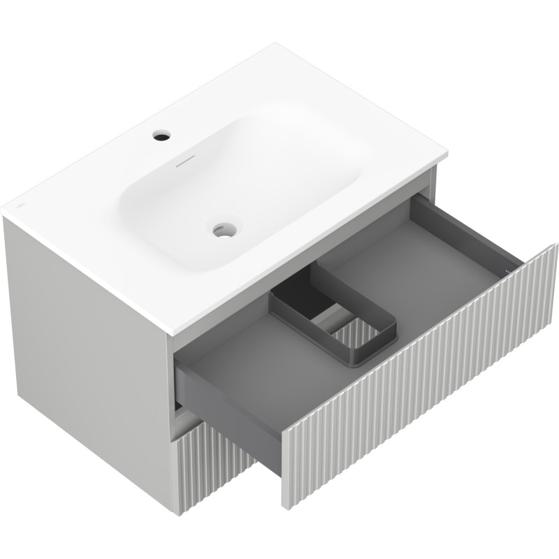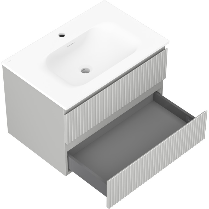 Špecifikácia produktu: Rozmery skrinky: Šírka: 70 cm Hĺbka: 46 cm Výška: 47 cm Farba korpusu: Matne šedá Materiál korpusu: Lakovaná doska Farba čela: Matne šedá Materiál čela: Lakovaná MDF doska Štruktúra čela: Drážkovaná Počet zásuviek: 2 UV žiarenie Rozmery umývadla: Šírka: 71 cm Hĺbka: 46,5 cm Výška: 16,5 cm Farba umývadla: Matne biela Materiál umývadla: Konglomerát Otvor na prepad: Áno Otvor na batériu: Áno Zmontovaný výrobok