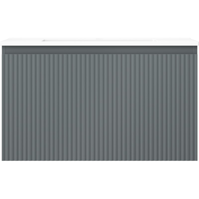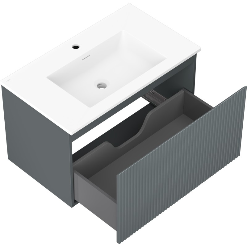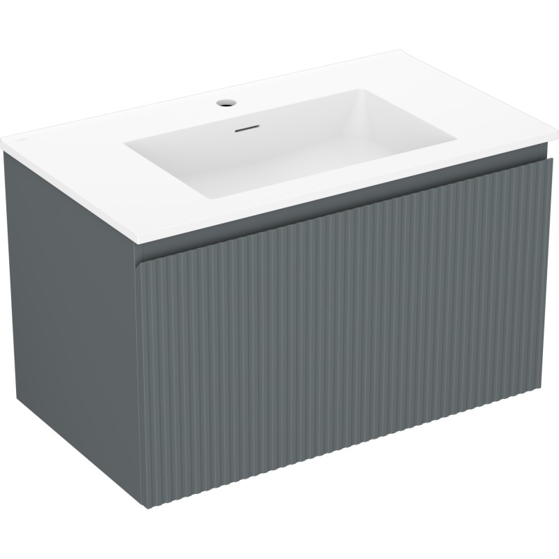 Špecifikácia produktu: Rozmery skrinky: Šírka: 80 cm Hĺbka: 46 cm Výška: 47 cm Farba korpusu: Matný grafit Materiál korpusu: Lakovaná doska Farba čela: Matný grafit Materiál čela: Lakovaná MDF doska Štruktúra čela: Drážkovaná Počet zásuviek: 1 odolný voči UV žiareniu Rozmery umývadla: Šírka: 81 cm Hĺbka: 46,5 cm Výška: 16,5 cm Farba umývadla: Matná biela Materiál umývadla: Konglomerát Otvor pre prepad: Áno Otvor pre batériu: Áno Zmontovaný výrobok