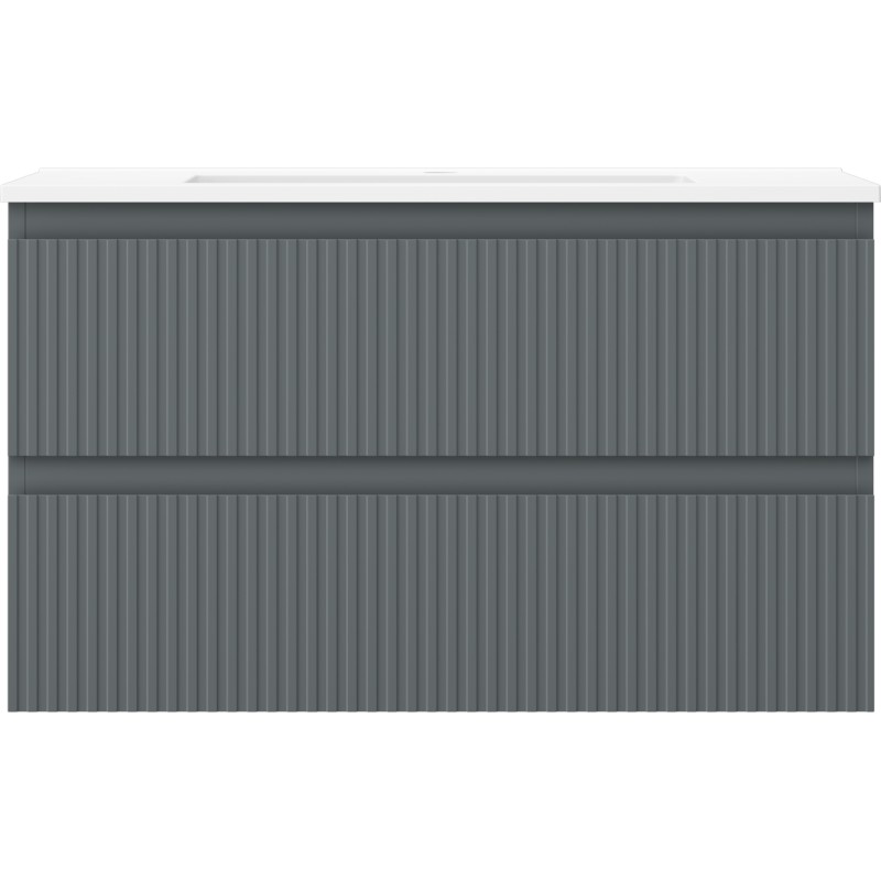 Špecifikácia produktu: Rozmery skrinky: Šírka: 80 cm Hĺbka: 46 cm Výška: 47 cm Farba korpusu: Matný grafit Materiál korpusu: Lakovaná doska Farba čela: Matný grafit Materiál čela: Lakovaná MDF doska Štruktúra čela: Drážkovaná Počet zásuviek: 2 odolný voči UV žiareniu Rozmery umývadla: Šírka: 81 cm Hĺbka: 46,5 cm Výška: 16,5 cm Farba umývadla: Matná biela Materiál umývadla: Konglomerát Otvor pre prepad: Áno Otvor pre batériu: Áno Zmontovaný výrobok