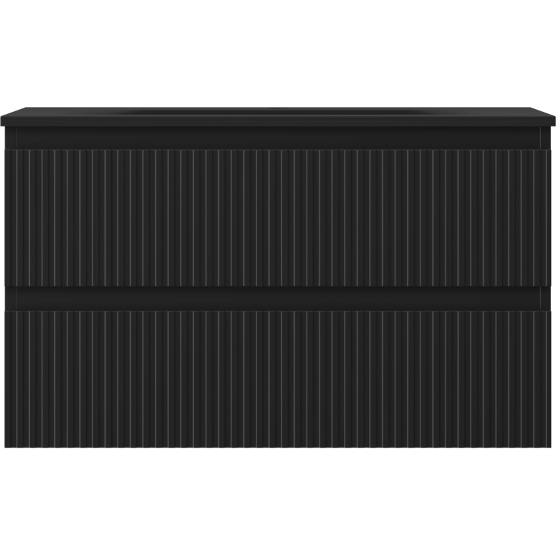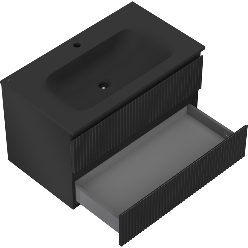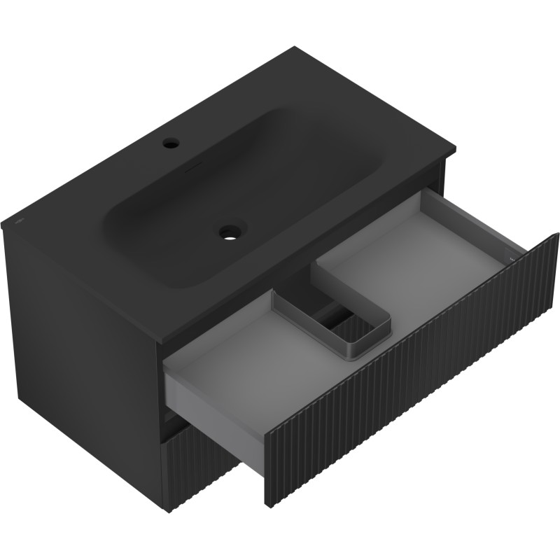 Špecifikácia produktu: Rozmery skrinky: Šírka: 80 cm Hĺbka: 46 cm Výška: 47 cm Farba korpusu: Matná čierna Materiál korpusu: Lakovaná doska Farba čela: Matná čierna Materiál čela: Lakovaná MDF doska Štruktúra čela: Drážkovaná Počet zásuviek: 2 Priestorná žiarenie Rozmery umývadla: Šírka: 81 cm Hĺbka: 46,5 cm Výška: 16,5 cm Farba umývadla: Matná čierna Materiál umývadla: Konglomerát Otvor pre prepad: Áno Otvor pre batériu: Áno Zmontovaný výrobok