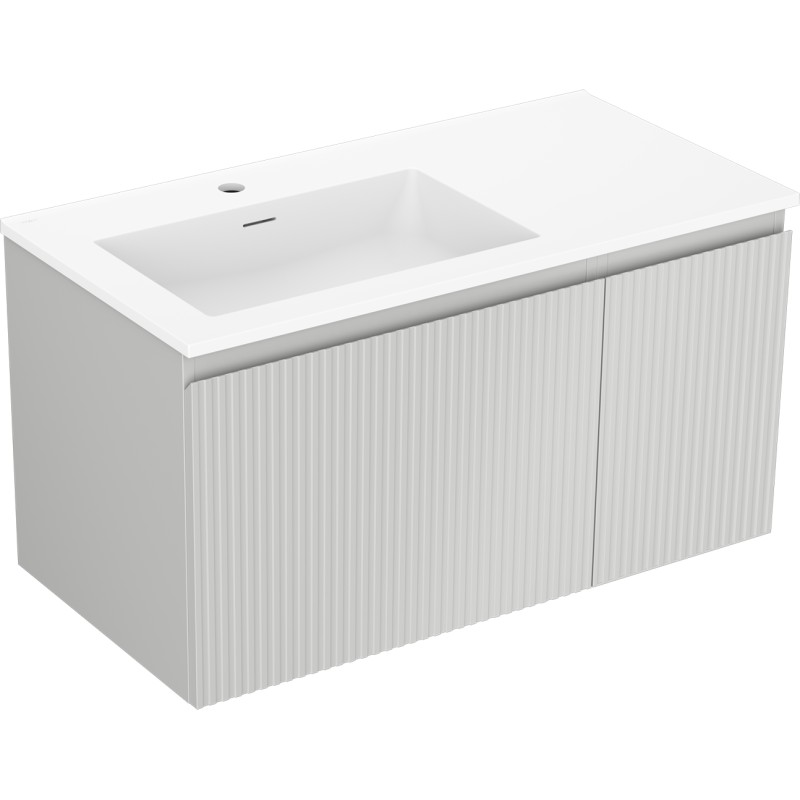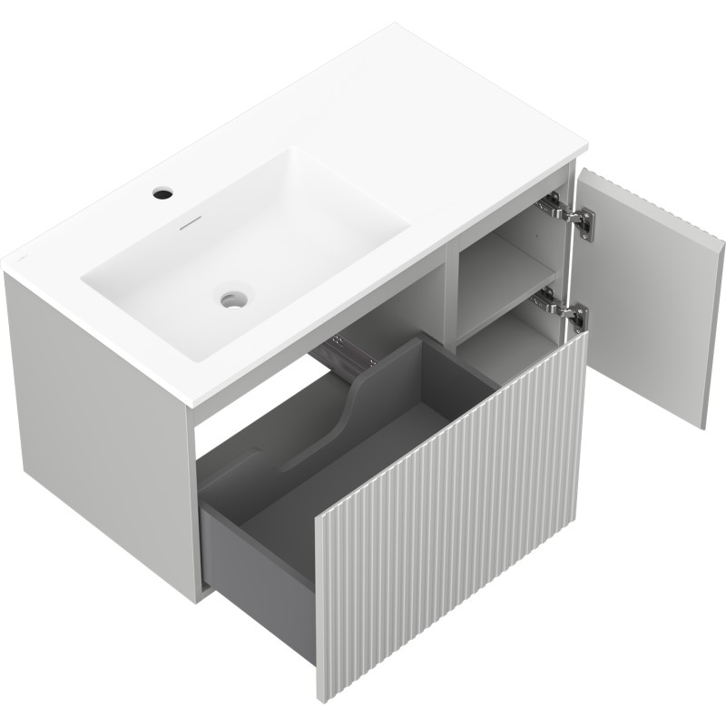 Špecifikácia produktu: Rozmery skrinky: Šírka: 90 cm Hĺbka: 46 cm Výška: 47 cm Sada obsahuje: Zásuvková skrinka pod umývadlo: Šírka: 60 cm Hĺbka: 46 cm Výška: 47 cm Farba korpusu: Matne šedá Materiál korpusu: Matne šedá Materiál korpusu: Lakovaná MDF doska Konštrukcia čela: Drážkovaná Počet zásuviek: 1 Priestranná zásuvka s funkciou tlmenia dovierania Povrch odolný voči UV žiareniu Skrinka pod umývadlo s dvierkami: Šírka: 30 cm Výška: 47 cm Hĺbka: 46 cm Farba korpusu: Matne šedá Materiál čela: Lakovaná MDF doska Konštrukcia čela: Drážkovaná Počet dvierok: 1 1 polica Pánty s funkciou tlmenia dovierania Univerzálna montáž dvierok (ľavé/pravé) Povrch odolný voči UV žiareniu Umývadlo: Šírka: 91 cm Hĺbka: 46,5 cm biela Materiál umývadla: Konglomerát Otvor na prepad: Áno Otvor na batériu: Áno Zmontovaný výrobok