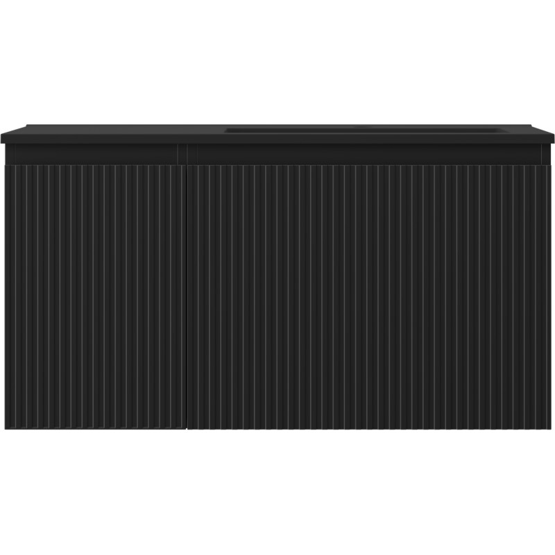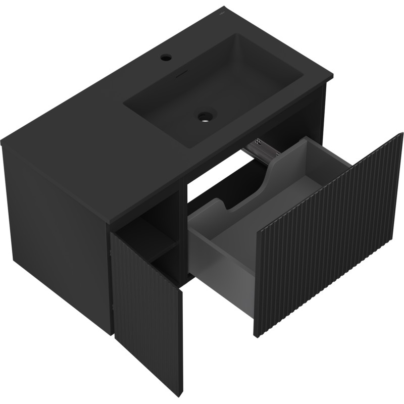 Špecifikácia produktu: Rozmery skrinky: Šírka: 90 cm Hĺbka: 46 cm Výška: 47 cm Sada obsahuje: Zásuvková skrinka pod umývadlo: Šírka: 60 cm Hĺbka: 46 cm Výška: 47 cm Farba korpusu: Matná čierna Materiál korpusu: Lak Lakovaná MDF doska Konštrukcia čela: Drážkovaná Počet zásuviek: 1 Priestranná zásuvka s funkciou tlmenia dovierania Povrch odolný voči UV žiareniu Skrinka pod umývadlo s dvierkami: Šírka: 30 cm Výška: 47 cm Hĺbka: čierna Farba korpusu: Matná Materiál čela: Lakovaná MDF doska Konštrukcia čela: Drážkovaná Počet dvierok: 1 1 polica Pánty s funkciou tlmenia dovierania Univerzálna montáž dvierok (ľavé/pravé) Povrch odolný voči UV žiareniu Umývadlo: Šírka: 91 cm Hĺbka: 46,5 cm Výška umývadlá: Konglomerát Otvor pre prepad: Áno Otvor pre batériu: Áno Zmontovaný produkt