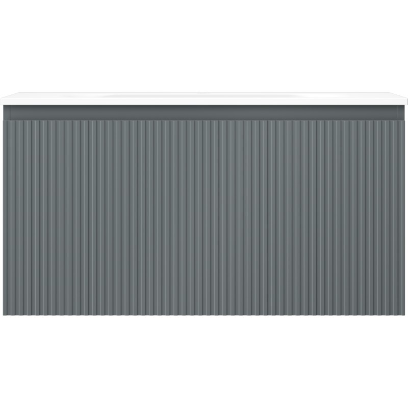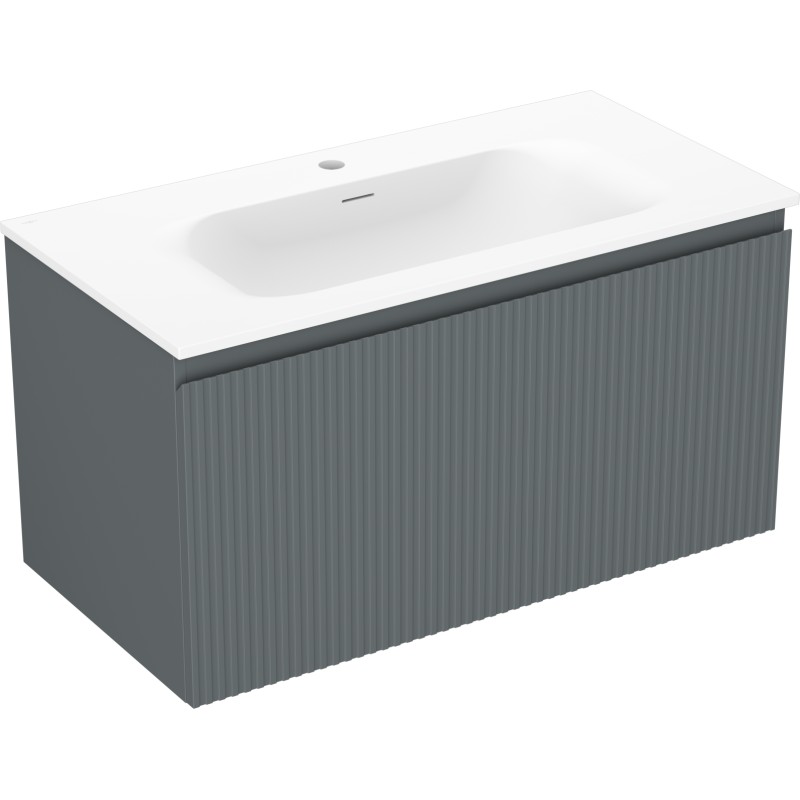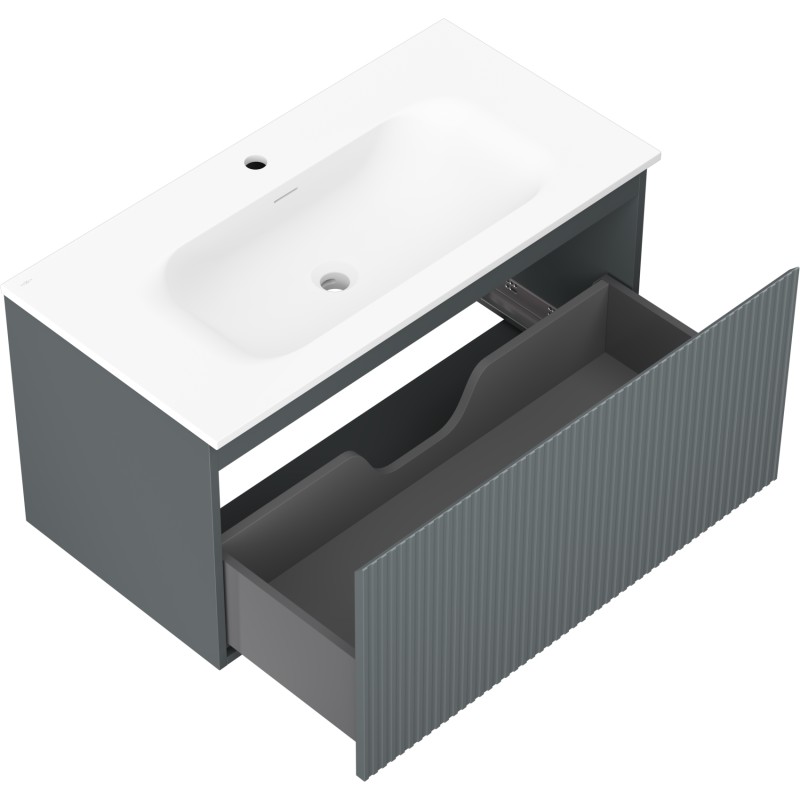 Špecifikácia produktu: Rozmery skrinky: Šírka: 90 cm Hĺbka: 46 cm Výška: 47 cm Farba korpusu: Matný grafit Materiál korpusu: Lakovaná doska Farba čela: Matný grafit Materiál čela: Lakovaná MDF doska Štruktúra čela: Drážkovaná Počet zásuviek: 1 odolný voči UV žiareniu Rozmery umývadla: Šírka: 91 cm Hĺbka: 46,5 cm Výška: 16,5 cm Farba umývadla: Matná biela Materiál umývadla: Konglomerát Otvor pre prepad: Áno Otvor pre batériu: Áno Zmontovaný výrobok