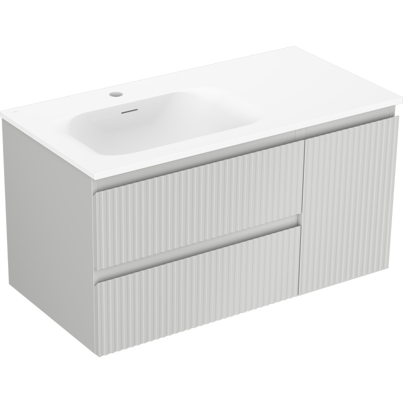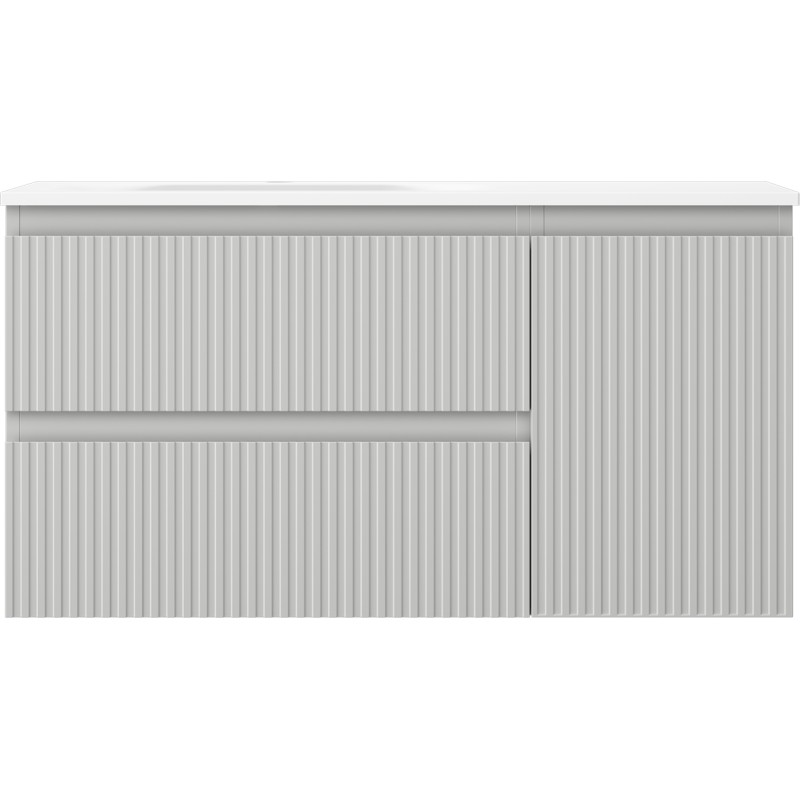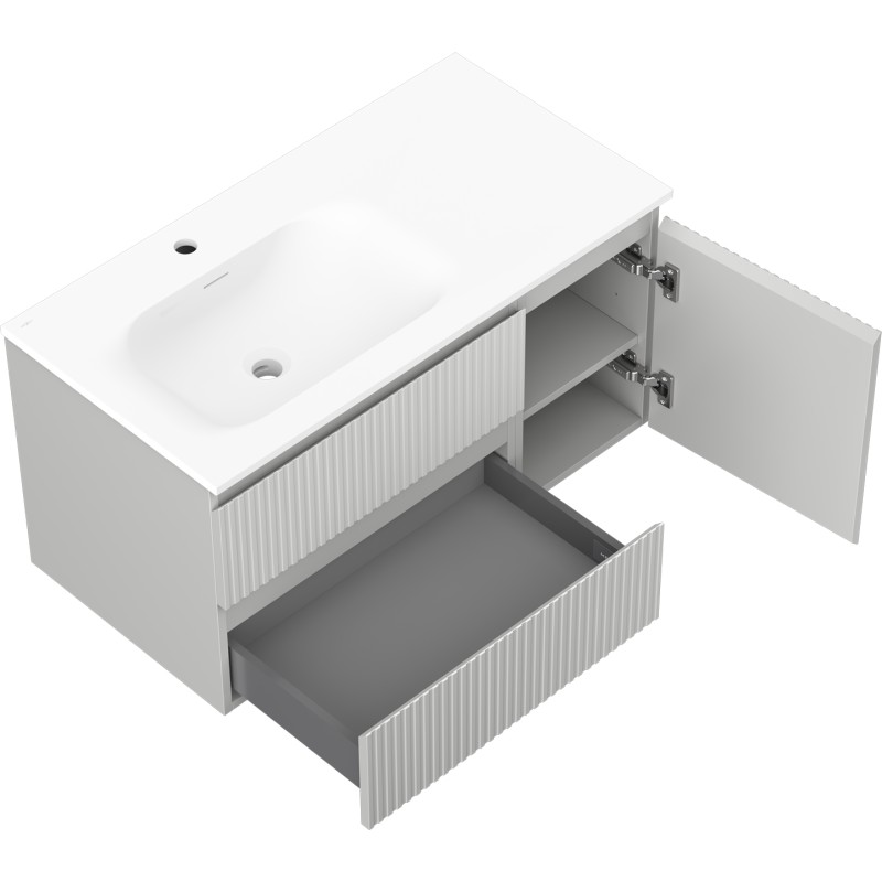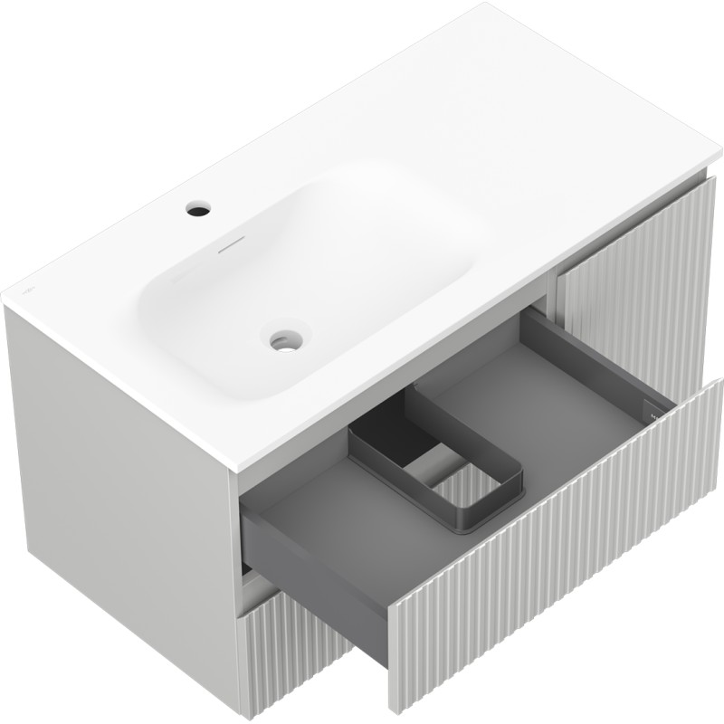 Špecifikácia produktu: Rozmery skrinky: Šírka: 90 cm Hĺbka: 46 cm Výška: 47 cm Sada obsahuje: Zásuvková skrinka pod umývadlo: Šírka: 60 cm Hĺbka: 46 cm Výška: 47 cm Farba korpusu: Matne šedá Materiál korpusu: Matne šedá Materiál korpusu: Lakovaná MDF doska Konštrukcia čela: Drážkovaná Počet zásuviek: 2 Priestranná zásuvka s funkciou tlmenia dovierania Povrch odolný proti UV žiareniu Skrinka pod umývadlo s dvierkami: Šírka: 30 cm Výška: 47 cm Hĺbka: 46 cm Farba korpusu: Matne šedá Materiál čela: Lakovaná MDF doska Konštrukcia čela: Drážkovaná Počet dvierok: 1 1 polica Pánty s funkciou tlmenia dovierania Univerzálna montáž dvierok (ľavé/pravé) Povrch odolný proti UV žiareniu Umývadlo: Šírka: 91 cm Hĺbka: 46,5 cm biela Materiál umývadla: Konglomerát Otvor na prepad: Áno Otvor na batériu: Áno Produkt zmontovaný