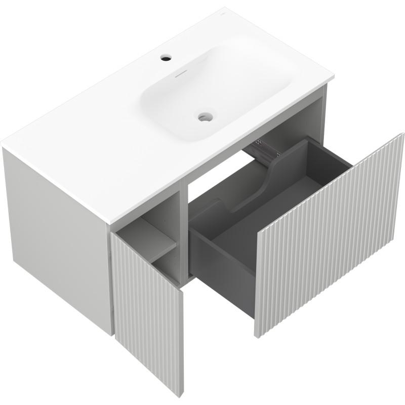 Špecifikácia produktu: Rozmery skrinky: Šírka: 90 cm Hĺbka: 46 cm Výška: 47 cm Sada obsahuje: Zásuvková skrinka pod umývadlo: Šírka: 60 cm Hĺbka: 46 cm Výška: 47 cm Farba korpusu: Matne šedá Materiál korpusu: Matne šedá Materiál korpusu: Lakovaná MDF doska Konštrukcia čela: Drážkovaná Počet zásuviek: 1 Priestranná zásuvka s funkciou tlmenia dovierania Povrch odolný voči UV žiareniu Skrinka pod umývadlo s dvierkami: Šírka: 30 cm Výška: 47 cm Hĺbka: 46 cm Farba korpusu: Matne šedá Materiál čela: Lakovaná MDF doska Konštrukcia čela: Drážkovaná Počet dvierok: 1 1 polica Pánty s funkciou tlmenia dovierania Univerzálna montáž dvierok (ľavé/pravé) Povrch odolný voči UV žiareniu Umývadlo: Šírka: 91 cm Hĺbka: 46,5 cm biela Materiál umývadla: Konglomerát Otvor na prepad: Áno Otvor na batériu: Áno Zmontovaný výrobok