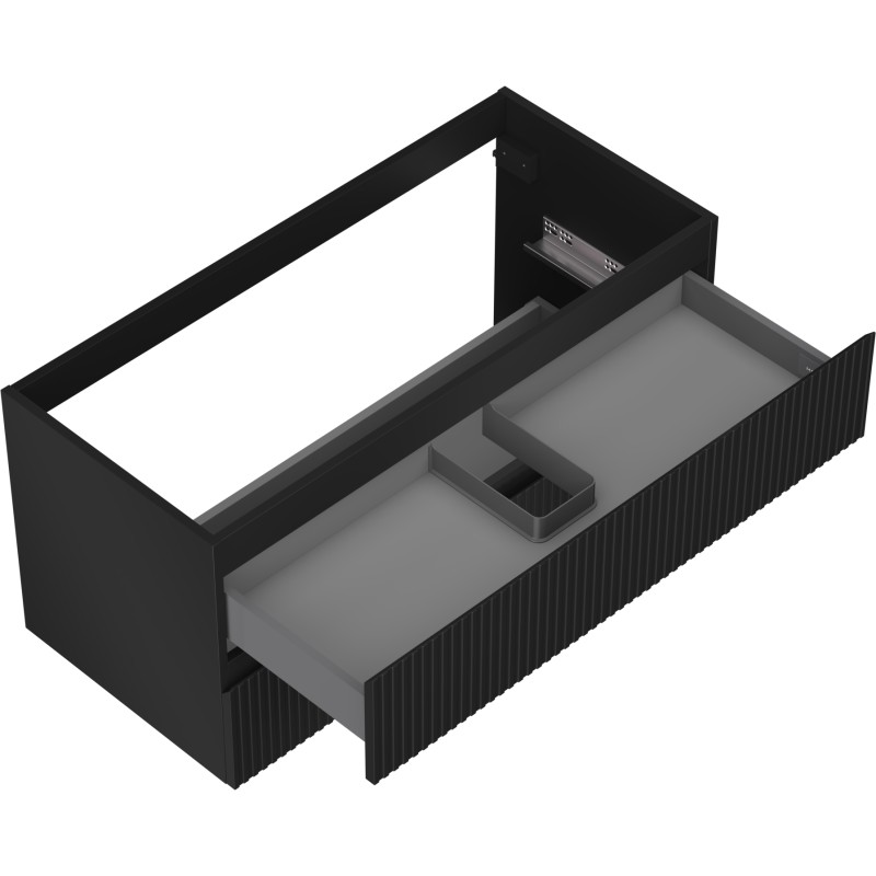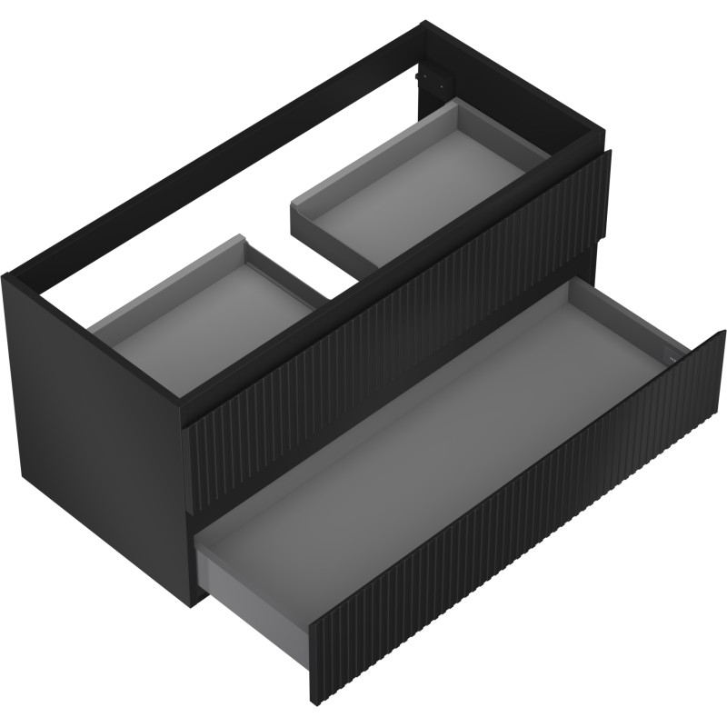 Špecifikácia produktu: Šírka: 100 cm Výška: 47 cm Hĺbka: 46 cm Farba korpusu: Matná čierna Materiál korpusu: Lakovaná doska Farba čela: Matná čierna Materiál čela: Lakovaná MDF doska Štruktúra čela: Drážkovaná Počet zásuviek: 2 Priestranná zásuvka s funkciou tlmný Povrch odolný voči UV žiareniu Kombinovateľný s pracovnou doskou alebo umývadlom Otis, Vela Zmontovaný produkt