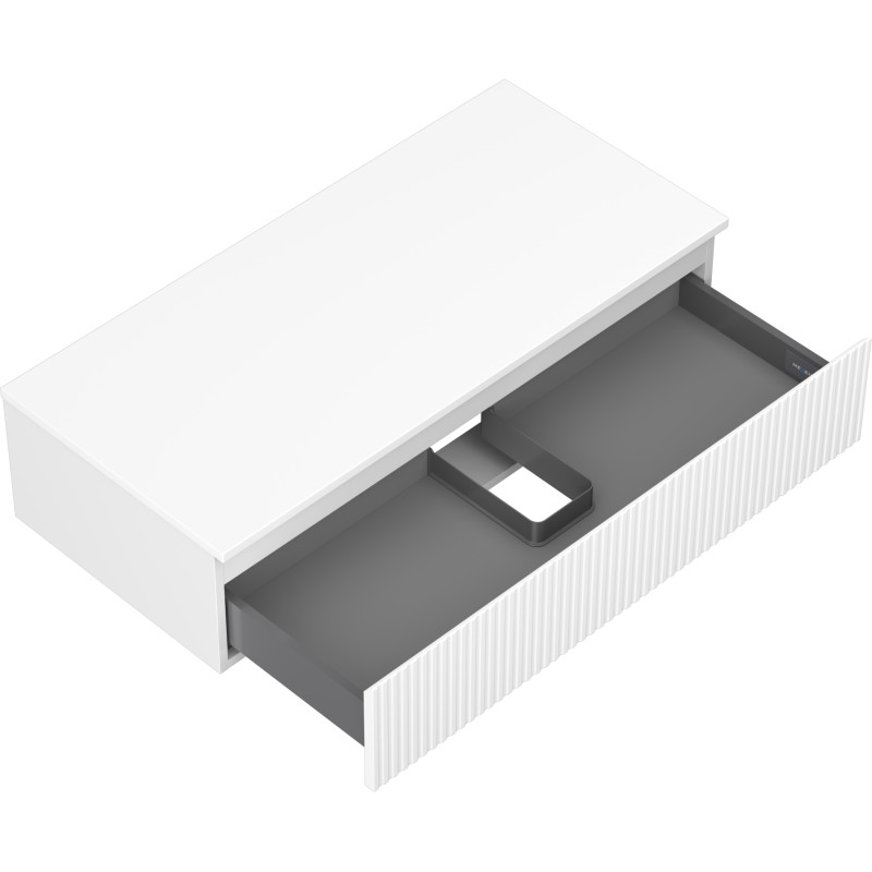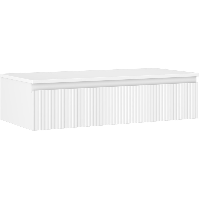 Špecifikácia produktu: Rozmery skrinky: Šírka: 100 cm Výška: 23,5 cm Hĺbka: 46 cm Farba korpusu: Matná biela Materiál korpusu: Lakovaná doska Farba čela: Matná biela Materiál čela: Lakovaná MDF doska Štruktúra čela: Drážkovaná Počet zásuviek Plný výsuv pre ľahký prístup k obsahu zásuvky Povrch odolný voči UV žiareniu Rozmery pracovnej dosky: Šírka: 100,6 cm Hĺbka: 46,5 cm Hrúbka: 1,8 cm Farba pracovnej dosky: Matná biela Materiál pracovnej dosky: Lakovaná MDF doska Povrch odolný voči UV žiareniu