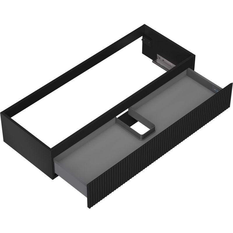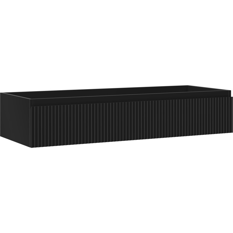 Špecifikácia produktu: Šírka: 120 cm Výška: 23,5 cm Hĺbka: 46 cm Farba korpusu: Matná čierna Materiál korpusu: Lakovaná doska Farba čela: Matná čierna Materiál čela: Lakovaná MDF doska Štruktúra čela: Drážkovaná Počet zásuviek: 1 Priestranná zásuvka s funkciou zásuvky Povrch odolný voči UV žiareniu Kombinovateľný s pracovnou doskou alebo umývadlom Otis, Vela Zmontovaný produkt