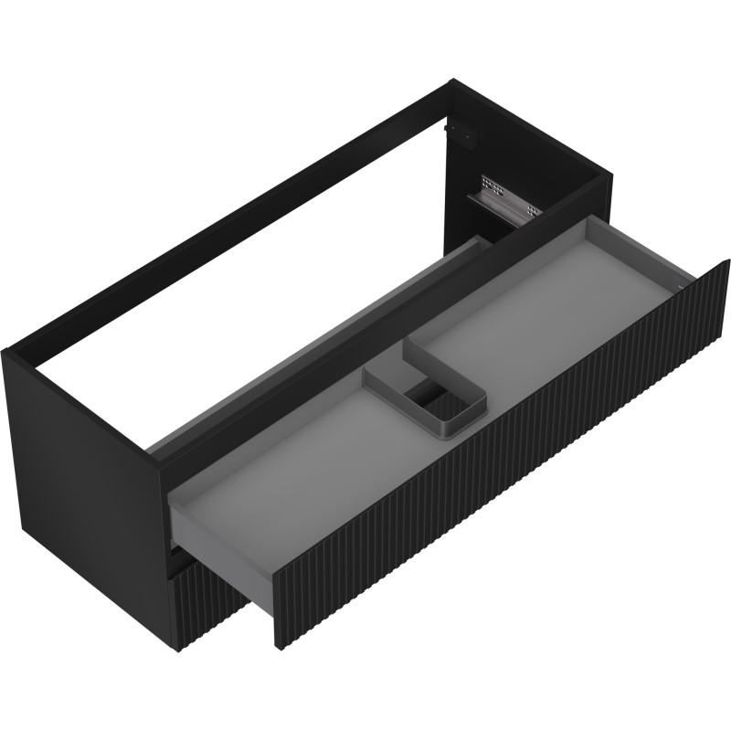 Špecifikácia produktu: Šírka: 120 cm Výška: 47 cm Hĺbka: 46 cm Farba korpusu: Matná čierna Materiál korpusu: Lakovaná doska Farba čela: Matná čierna Materiál čela: Lakovaná MDF doska Štruktúra čela: Drážkovaná Počet zásuviek: 2 Priestranná zásuvka s funkciou tlmný Povrch odolný voči UV žiareniu Kombinovateľný s pracovnou doskou alebo umývadlom Otis, Vela Zmontovaný produkt