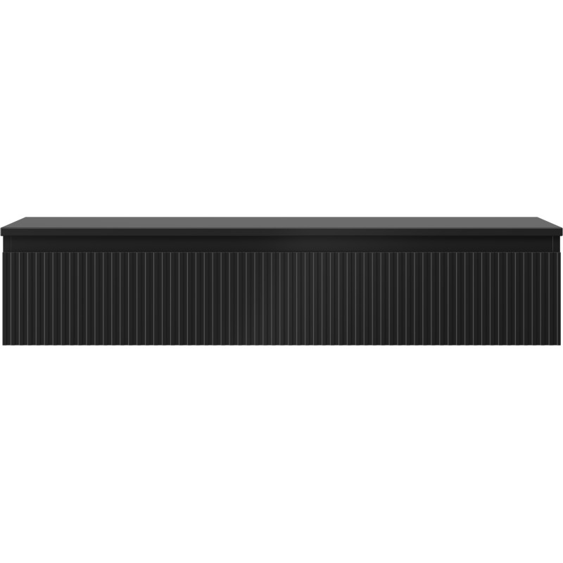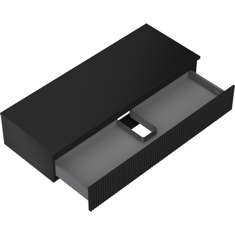 Špecifikácia produktu: Rozmery skrinky: Šírka: 120 cm Výška: 23,5 cm Hĺbka: 46 cm Farba korpusu: Matná čierna Materiál korpusu: Lakovaná doska Farba čela: Matná čierna Materiál čela: Lakovaná MDF doska Štruktúra čela: Drážkovaná Počet zásuviek: 1 výsuv pre ľahký prístup k obsahu zásuvky Povrch odolný voči UV žiareniu Rozmery pracovnej dosky: Šírka: 120,6 cm Hĺbka: 46,5 cm Hrúbka: 1,8 cm Farba pracovnej dosky: Matná čierna Materiál pracovnej dosky: Lakovaná MDF doska Povrch odolný voči UV žiareniu Ideálny ako podstavec