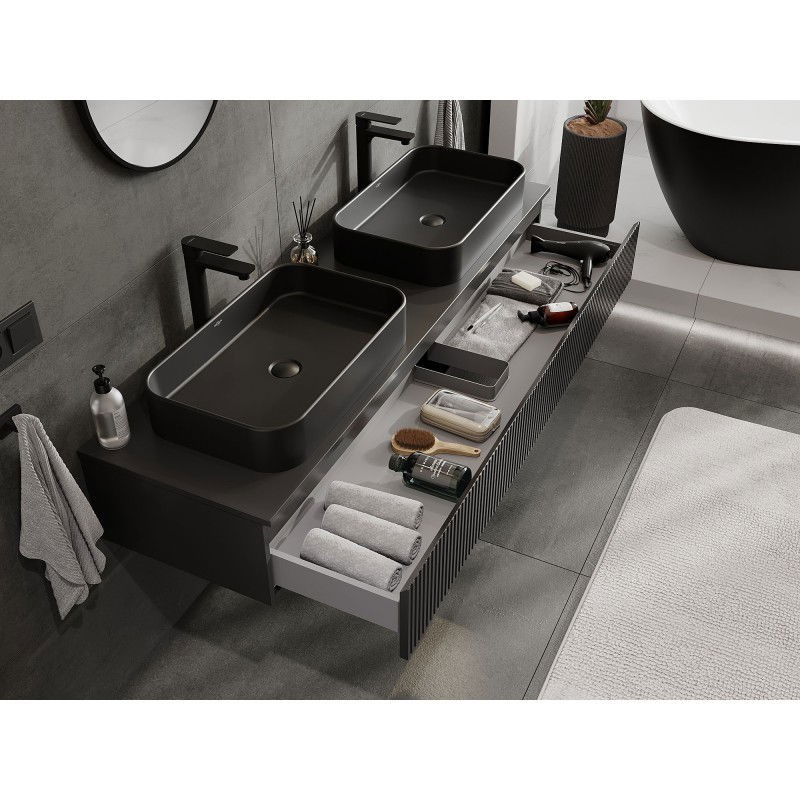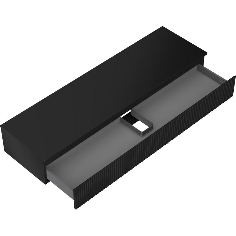 Špecifikácia produktu: Rozmery skrinky: Šírka: 160 cm Výška: 23,5 cm Hĺbka: 46 cm Farba korpusu: Matná čierna Materiál korpusu: Lakovaná doska Farba čela: Matná čierna Materiál čela: Lakovaná MDF doska Štruktúra čela: Drážkovaná Počet zásuviek: 1 výsuv pre ľahký prístup k obsahu zásuvky Povrch odolný voči UV žiareniu Rozmery pracovnej dosky: Šírka: 160,6 cm Hĺbka: 46,5 cm Hrúbka: 1,8 cm Farba pracovnej dosky: Matná čierna Materiál pracovnej dosky: Lakovaná MDF doska Povrch odolný voči UV žiareniu Ideálny ako podstavec