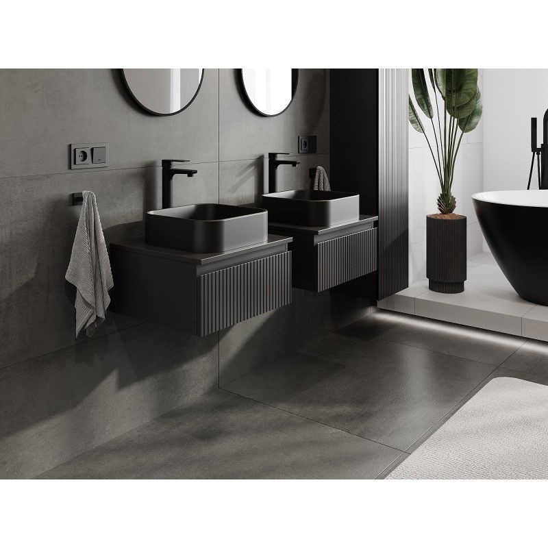 Špecifikácia produktu: Rozmery skrinky: Šírka: 50 cm Výška: 23,5 cm Hĺbka: 46 cm Farba korpusu: Matná čierna Materiál korpusu: Lakovaná doska Farba čela: Matná čierna Materiál čela: Lakovaná MDF doska Štruktúra čela: Drážkovaná Počet zásuviek: 1 pre ľahký prístup k obsahu zásuvky Povrch odolný voči UV žiareniu Rozmery pracovnej dosky: Šírka: 50,6 cm Hĺbka: 46,5 cm Hrúbka: 1,8 cm Farba pracovnej dosky: Matná čierna Materiál pracovnej dosky: Lakovaná MDF doska Povrch odolný voči UV žiareniu Ideálny ako podstavec pre umyva