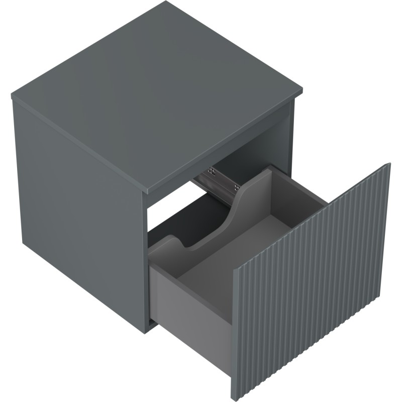 Špecifikácia produktu: Rozmery skrinky: Šírka: 50 cm Výška: 47 cm Hĺbka: 46 cm Farba korpusu: Matný grafit Materiál korpusu: Lakovaná doska Farba čela: Matný grafit Materiál čela: Lakovaná MDF doska Štruktúra čela: Drážkovaná Počet zásuviek: 1 výsuv pre ľahký prístup k obsahu zásuvky Povrch odolný voči UV žiareniu Rozmery pracovnej dosky: Šírka: 50,6 cm Hĺbka: 46,5 cm Hrúbka: 1,8 cm Farba pracovnej dosky: Matný grafit Materiál pracovnej dosky: Lakovaná MDF doska Povrch odolný voči UV žiareniu Ideálny ako podstavec