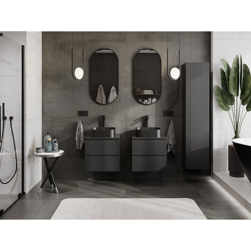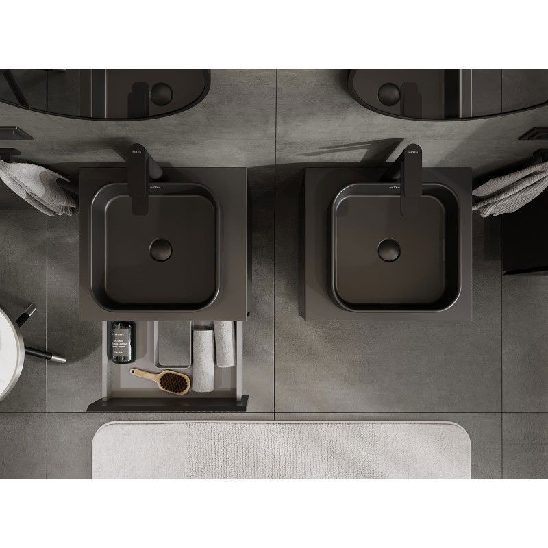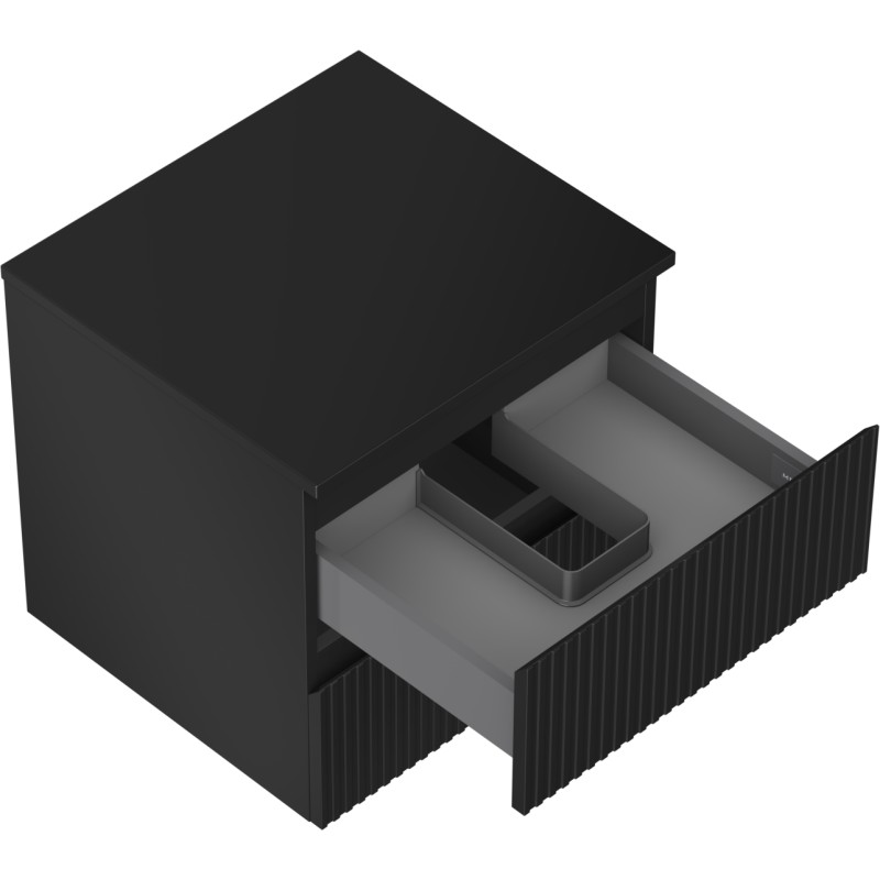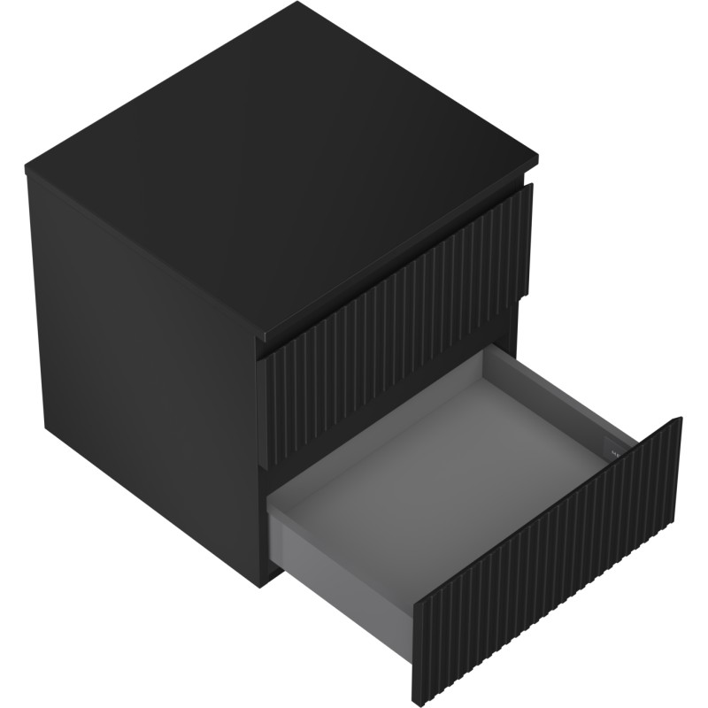 Špecifikácia produktu: Rozmery skrinky: Šírka: 50 cm Výška: 47 cm Hĺbka: 46 cm Farba korpusu: Matná čierna Materiál korpusu: Lakovaná doska Farba čela: Matná čierna Materiál čela: Lakovaná MDF doska Štruktúra čela: Drážkovaná Počet zásuviek: 2 Priestorná ľahký prístup k obsahu zásuvky Povrch odolný voči UV žiareniu Rozmery pracovnej dosky: Šírka: 50,6 cm Hĺbka: 46,5 cm Hrúbka: 1,8 cm Farba pracovnej dosky: Matná čierna Materiál pracovnej dosky: Lakovaná MDF doska Povrch odolný voči UV žiareniu Ideálny ako podstavec pre umývadlá