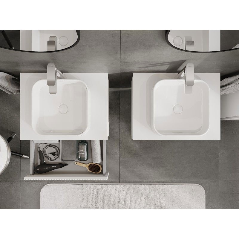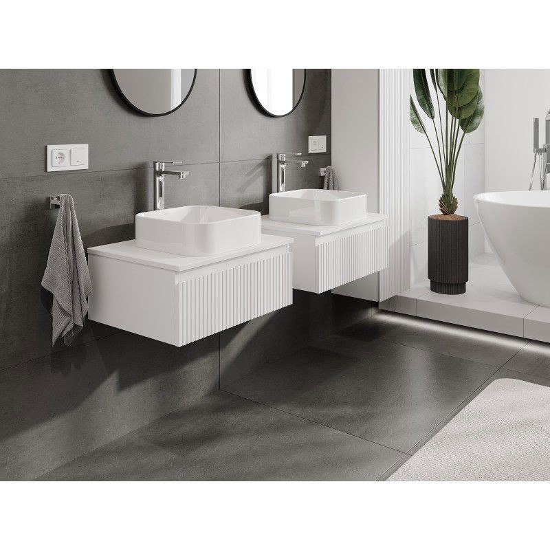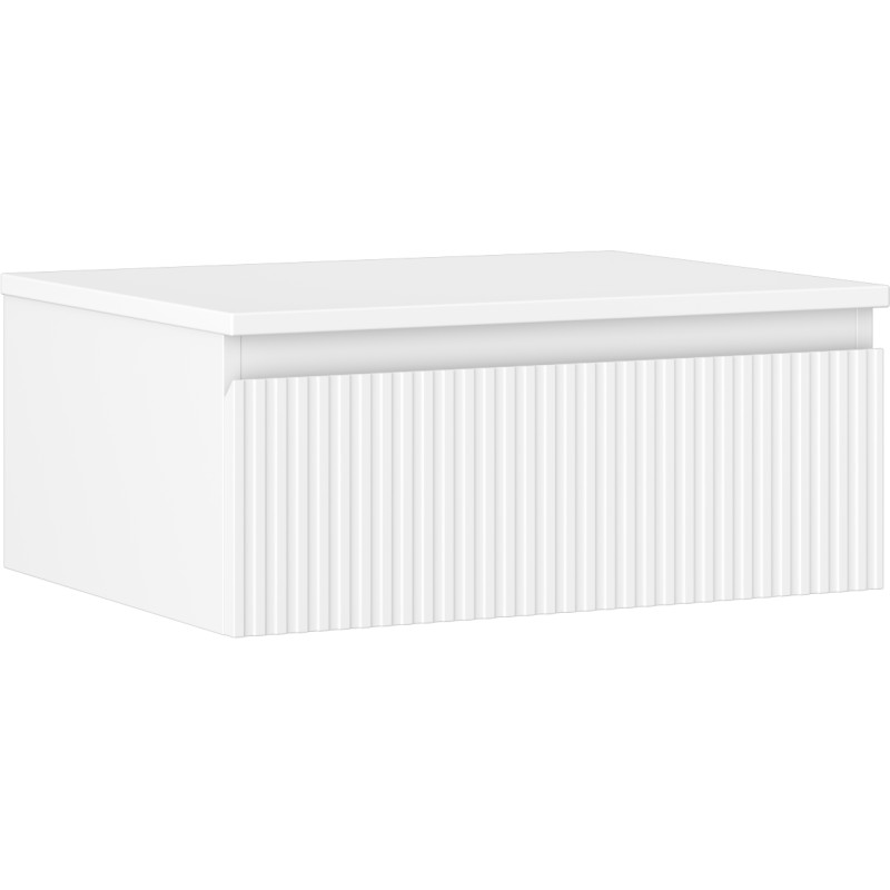 Špecifikácia produktu: Rozmery skrinky: Šírka: 60 cm Výška: 23,5 cm Hĺbka: 46 cm Farba korpusu: Matná biela Materiál korpusu: Lakovaná doska Farba čela: Matná biela Materiál čela: Lakovaná MDF doska Štruktúra čela: Drážkovaná Počet zásuviek: Plný výsuv pre ľahký prístup k obsahu zásuvky Povrch odolný voči UV žiareniu Rozmery pracovnej dosky: Šírka: 60,6 cm Hĺbka: 46,5 cm Hrúbka: 1,8 cm Farba pracovnej dosky: Matná biela Materiál pracovnej dosky: Lakovaná MDF doska Povrch odolný voči UV žiareniu Ideálny ako