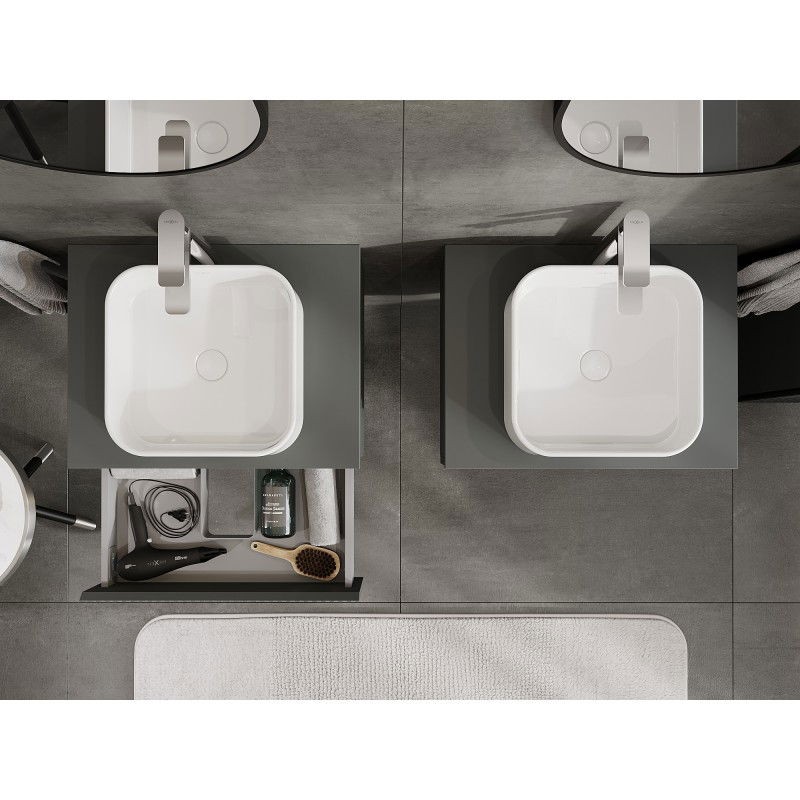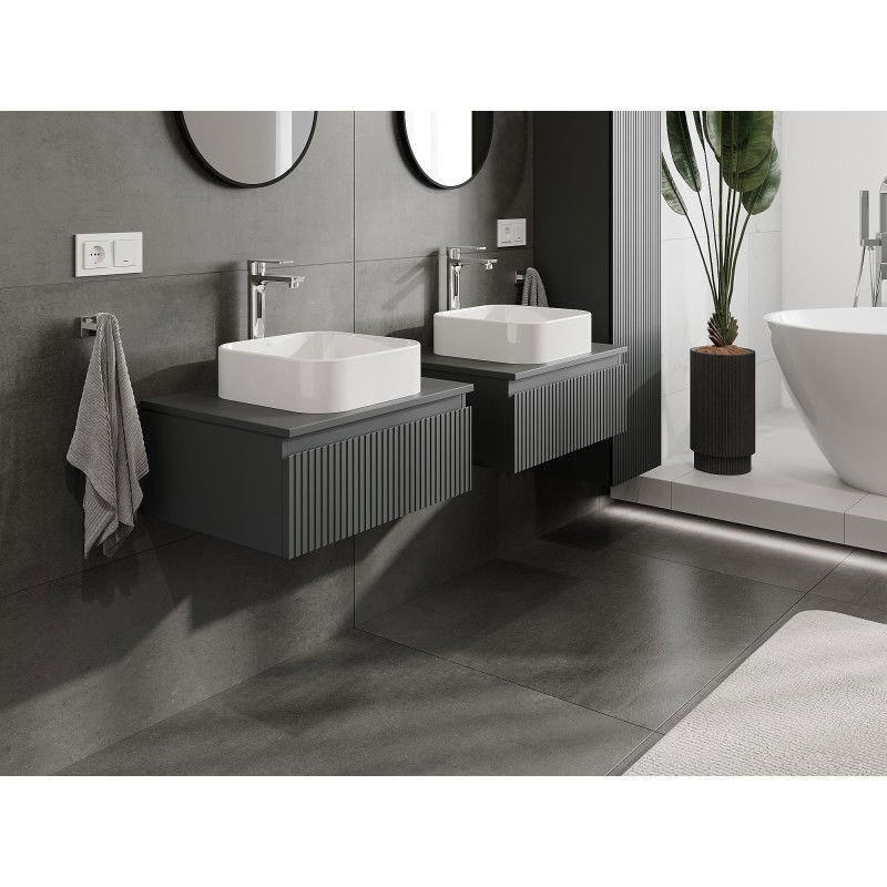 Špecifikácia produktu: Rozmery skrinky: Šírka: 60 cm Výška: 23,5 cm Hĺbka: 46 cm Farba korpusu: Matný grafit Materiál korpusu: Lakovaná doska Farba čela: Matný grafit Materiál čela: Lakovaná MDF doska Štruktúra čela: Drážkovaná Počet zásuviek: Plný výsuv pre ľahký prístup k obsahu zásuvky Povrch odolný voči UV žiareniu Rozmery pracovnej dosky: Šírka: 60,6 cm Hĺbka: 46,5 cm Hrúbka: 1,8 cm Farba pracovnej dosky: Matný grafit Materiál pracovnej dosky: Lakovaná MDF doska Povrch odolný voči UV žiareniu Ideálny ako