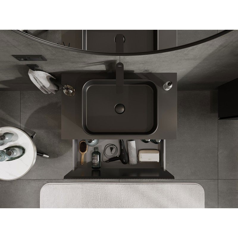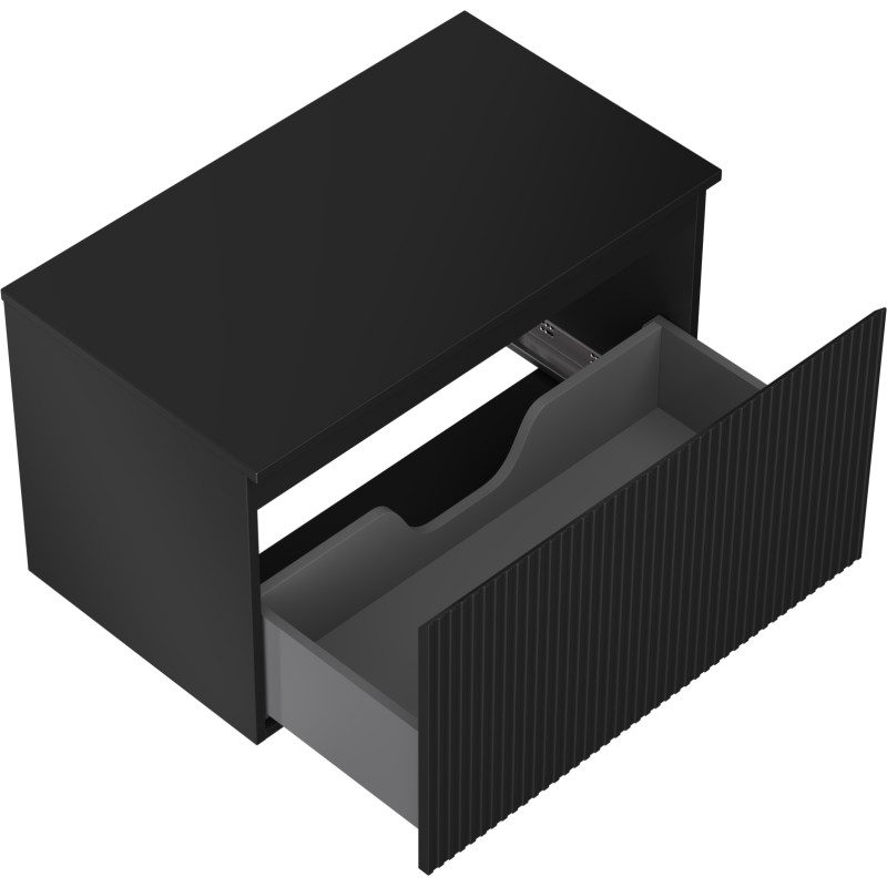 Špecifikácia produktu: Rozmery skrinky: Šírka: 80 cm Výška: 47 cm Hĺbka: 46 cm Farba korpusu: Matná čierna Materiál korpusu: Lakovaná doska Farba čela: Matná čierna Materiál čela: Lakovaná MDF doska Štruktúra čela: Drážkovaná Počet zásuviek: 1 Priestranná ľahký prístup k obsahu zásuvky Povrch odolný voči UV žiareniu Rozmery pracovnej dosky: Šírka: 80,6 cm Hĺbka: 46,5 cm Hrúbka: 1,8 cm Farba pracovnej dosky: Matná čierna Materiál pracovnej dosky: Lakovaná MDF doska Povrch odolný voči UV žiareniu Ideálny ako podstavec pre umývadlá
