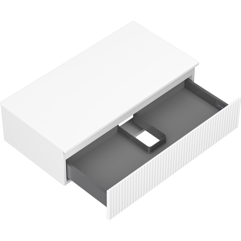 Špecifikácia produktu: Rozmery skrinky: Šírka: 90 cm Výška: 23,5 cm Hĺbka: 46 cm Farba korpusu: Matná biela Materiál korpusu: Lakovaná doska Farba čela: Matná biela Materiál čela: Lakovaná MDF doska Štruktúra čela: Drážkovaná Počet zásuviek: Plný výsuv pre ľahký prístup k obsahu zásuvky Povrch odolný voči UV žiareniu Rozmery pracovnej dosky: Šírka: 90,6 cm Hĺbka: 46,5 cm Hrúbka: 1,8 cm Farba pracovnej dosky: Matná biela Materiál pracovnej dosky: Lakovaná MDF doska Povrch odolný voči UV žiareniu Ideálny ako