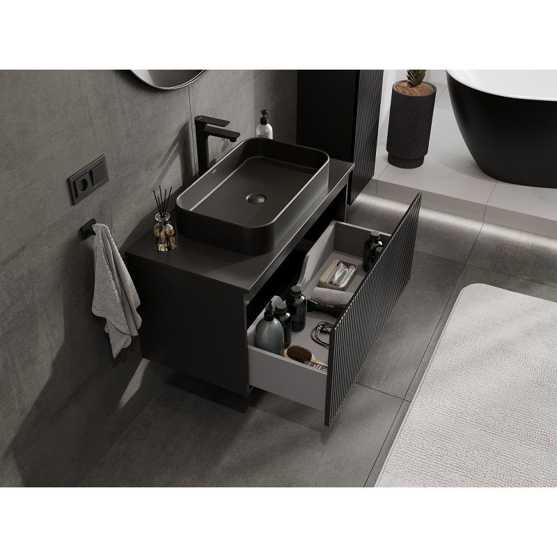 Špecifikácia produktu: Rozmery skrinky: Šírka: 90 cm Výška: 47 cm Hĺbka: 46 cm Farba korpusu: Matná čierna Materiál korpusu: Lakovaná doska Farba čela: Matná čierna Materiál čela: Lakovaná MDF doska Štruktúra čela: Drážkovaná Počet zásuviek: 1 Priestranná ľahký prístup k obsahu zásuvky Povrch odolný voči UV žiareniu Rozmery pracovnej dosky: Šírka: 90,6 cm Hĺbka: 46,5 cm Hrúbka: 1,8 cm Farba pracovnej dosky: Matná čierna Materiál pracovnej dosky: Lakovaná MDF doska Povrch odolný voči UV žiareniu Ideálny ako podstavec pre umývadlá