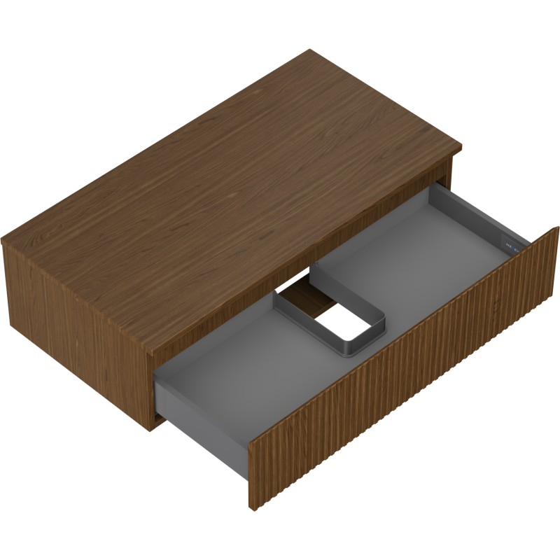 Špecifikácia produktu: Rozmery skrinky: Šírka: 90 cm Výška: 23,5 cm Hĺbka: 46 cm Farba korpusu: Orech Materiál korpusu: Doska + PVC fólia Farba čela: Orech Materiál čela: MDF doska + PVC fólia Štruktúra čela: Drážkovaná Počet zásuviek Plný výsuv pre ľahký prístup k obsahu zásuvky Povrch odolný voči UV žiareniu Rozmery pracovnej dosky: Šírka: 90,6 cm Hĺbka: 46,5 cm Hrúbka: 1,8 cm Farba pracovnej dosky: Orech Materiál pracovnej dosky: MDF doska + PVC fólia Povrch odolný voči UV žiareniu Ideálny ako