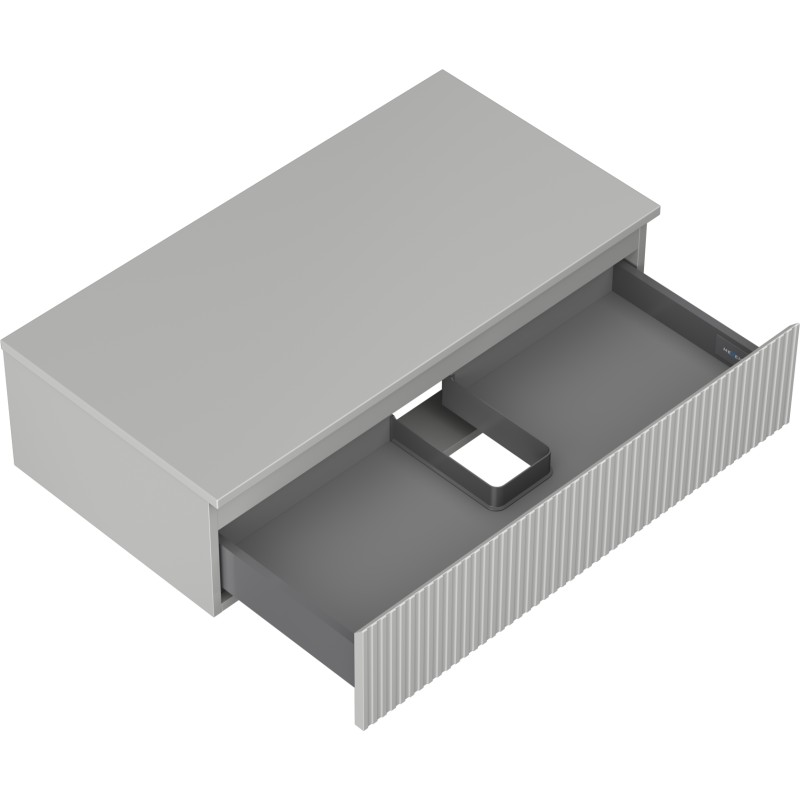 Špecifikácia produktu: Rozmery skrinky: Šírka: 90 cm Výška: 23,5 cm Hĺbka: 46 cm Farba korpusu: Matne šedá Materiál korpusu: Lakovaná doska Farba čela: Matne šedá Materiál čela: Lakovaná MDF doska Štruktúra čela: Drážkovaná Počet zásuviek: 1 výsuv pre ľahký prístup k obsahu zásuvky Povrch odolný voči UV žiareniu Rozmery pracovnej dosky: Šírka: 90,6 cm Hĺbka: 46,5 cm Hrúbka: 1,8 cm Farba pracovnej dosky: Matne šedá Materiál pracovnej dosky: Lakovaná MDF doska Povrch odolný voči UV žiareniu Ideálny ako podstavec