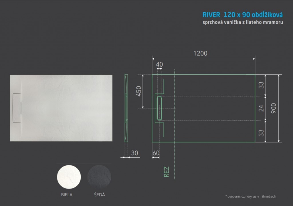 Aquatek - RIVER sprchová vanička z liateho mramoru, obdĺžnik, 120x90cm, biela (RIVER12090-B)