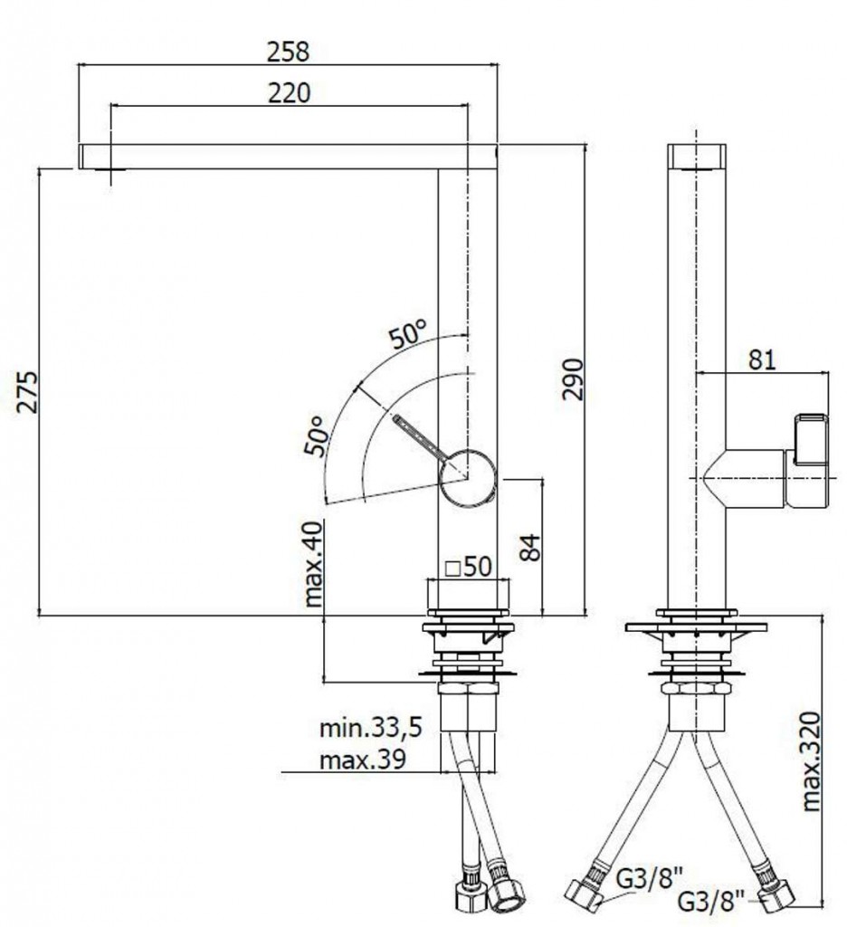 - dĺžka výtoku 220 mm, komfortná zóna 275 mm