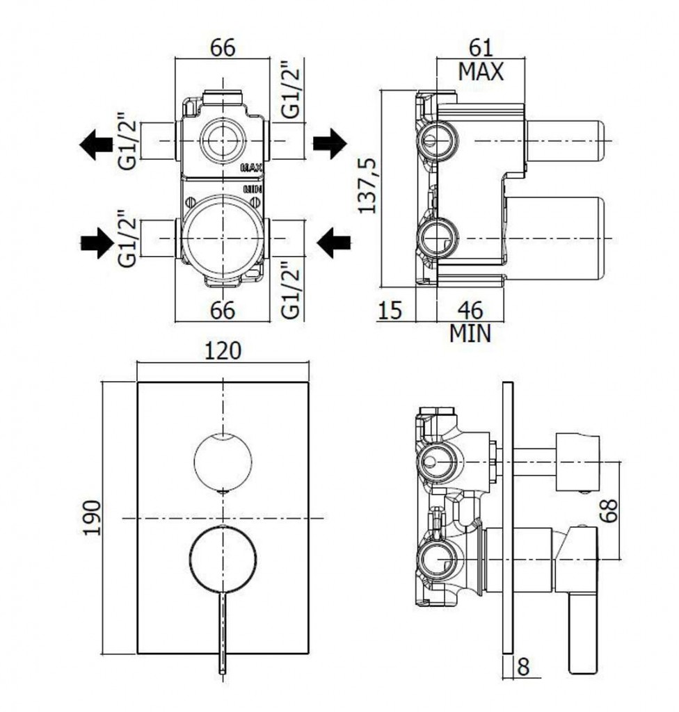 Sprchová páková batéria s otočným prepínačom vrátane podomietkového telesa pre 2 vývody