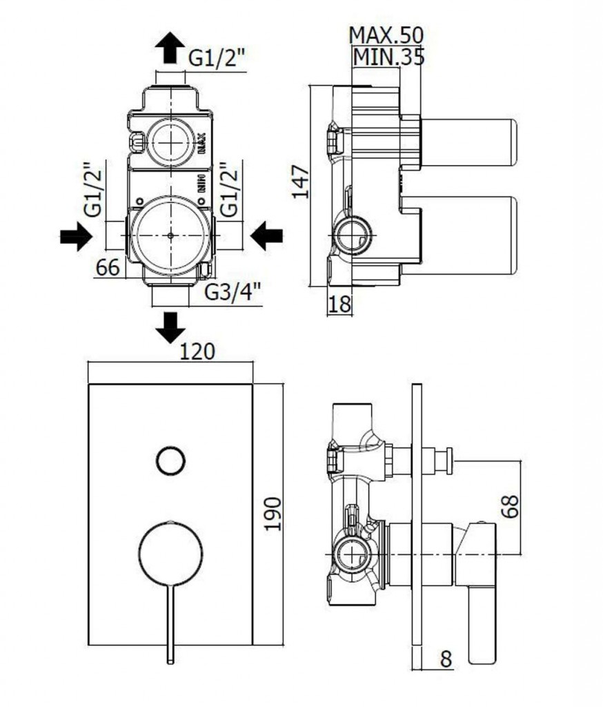 Sprchová páková batéria pod omietku s telesom a prepínačom