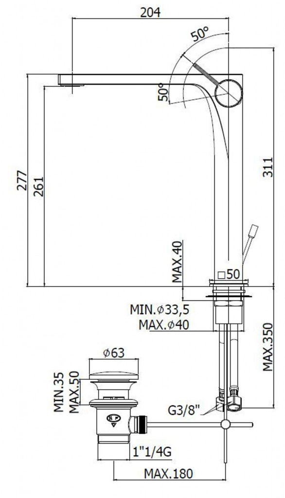 - dĺžka výtoku 204 mm, komfortná zóna 261 mm