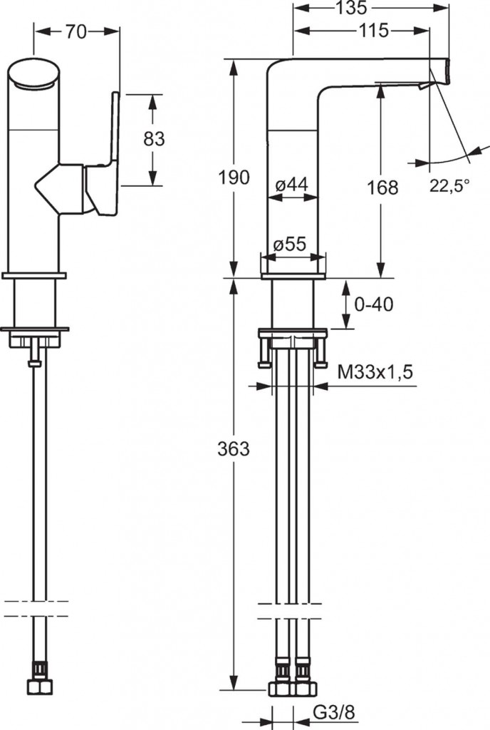 výtok: liaty, o 150 ° otočný (-) vyberateľná zarážka