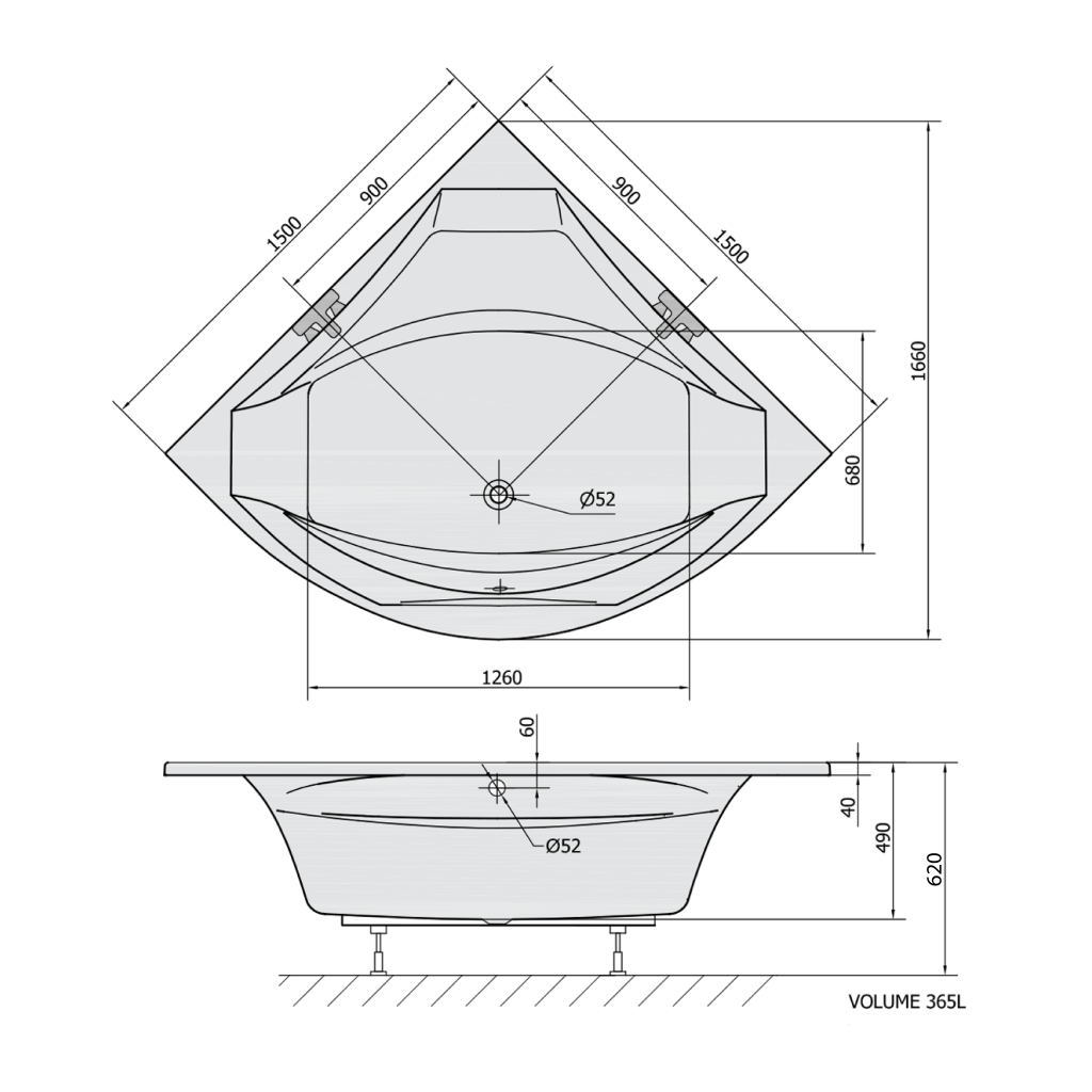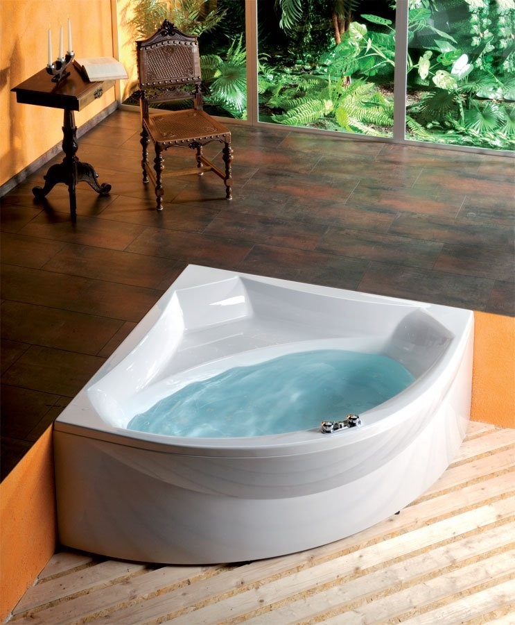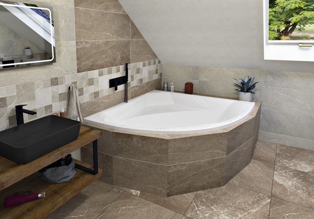 Vaňa s pohodlne tvarovanými stenami na opretie chrbta na oboch stranách a odtokom umiestneným uprostred.