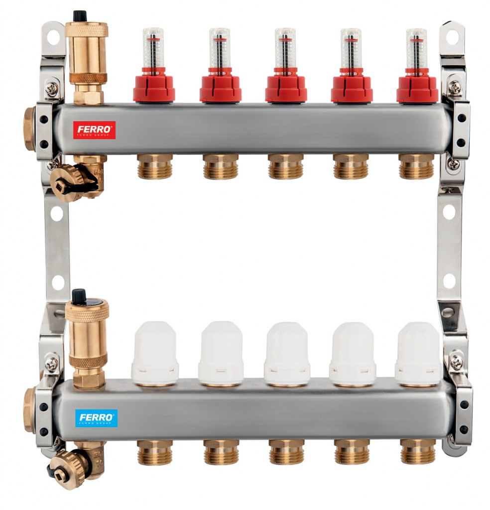 Nerezové rozdeľovače pre 2-12 vykurovaných okruhov osadené prietokomermi Taconova so zárukou 15 rokov. Kompletný sortiment príslušenstva vrátane náhradných dielov