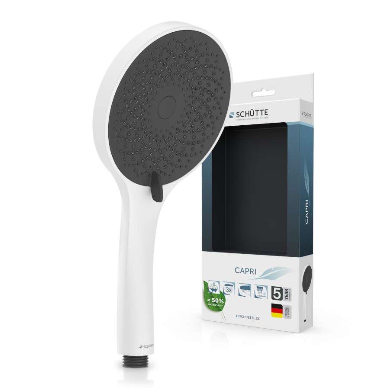Praktická ručná sprcha CAPRI v elegantnom matnom bielo/antracitovom prevedení kombinuje moderný dizajn s vysokou funkčnosťou. Vďaka tryskám s ochranou proti vodnému kameňu zostáva sprcha ľahko čistiteľná a prietok vody je stabilný aj pri dlhodobom používaní.
