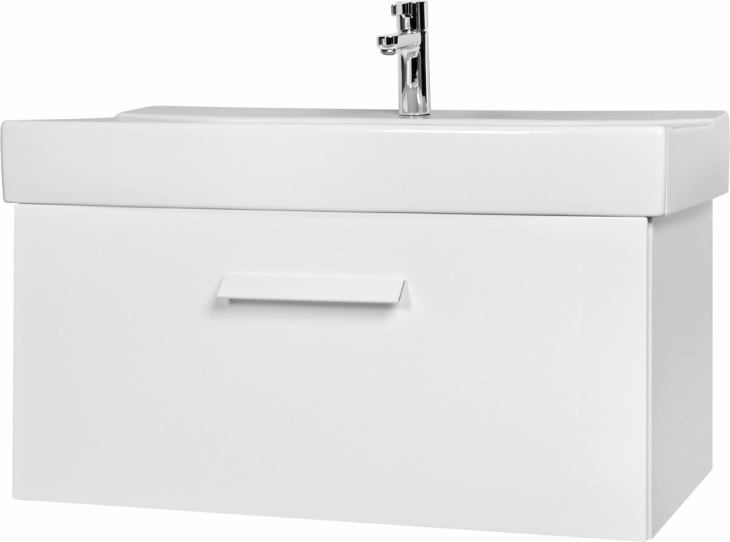 Moderní umyvadlová skříňka XANTIA v lesklém bílém provedení se zásuvkou.