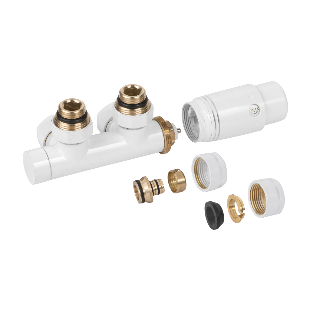 Pre zmenu polohy ventilu radiátora DUOPLEX sprava doľava použite nástrčné kľúče: pre prívodný ventil veľkosť kľúča 19, pre vratný ventil veľkosť kľúča 17. Rohový otočný ventil, použitie: na pripojenie kúpeľňového radiátora v medených alebo PEX inštaláciách, vľavo alebo vpravo. Súprava obsahuje: 1/2 spojky pre radiátory z medi 15 mm a PEX 16 mm, termostatickú hlavicu M30×1,5.