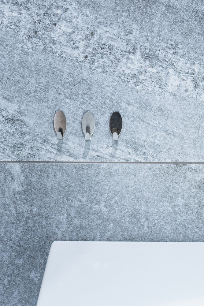 Malý vešiak oválneho tvaru z nerezovej ocele, ktorý sa pripevňuje na stenu samolepiacou páskou. V balení je 6 ks ramienok.