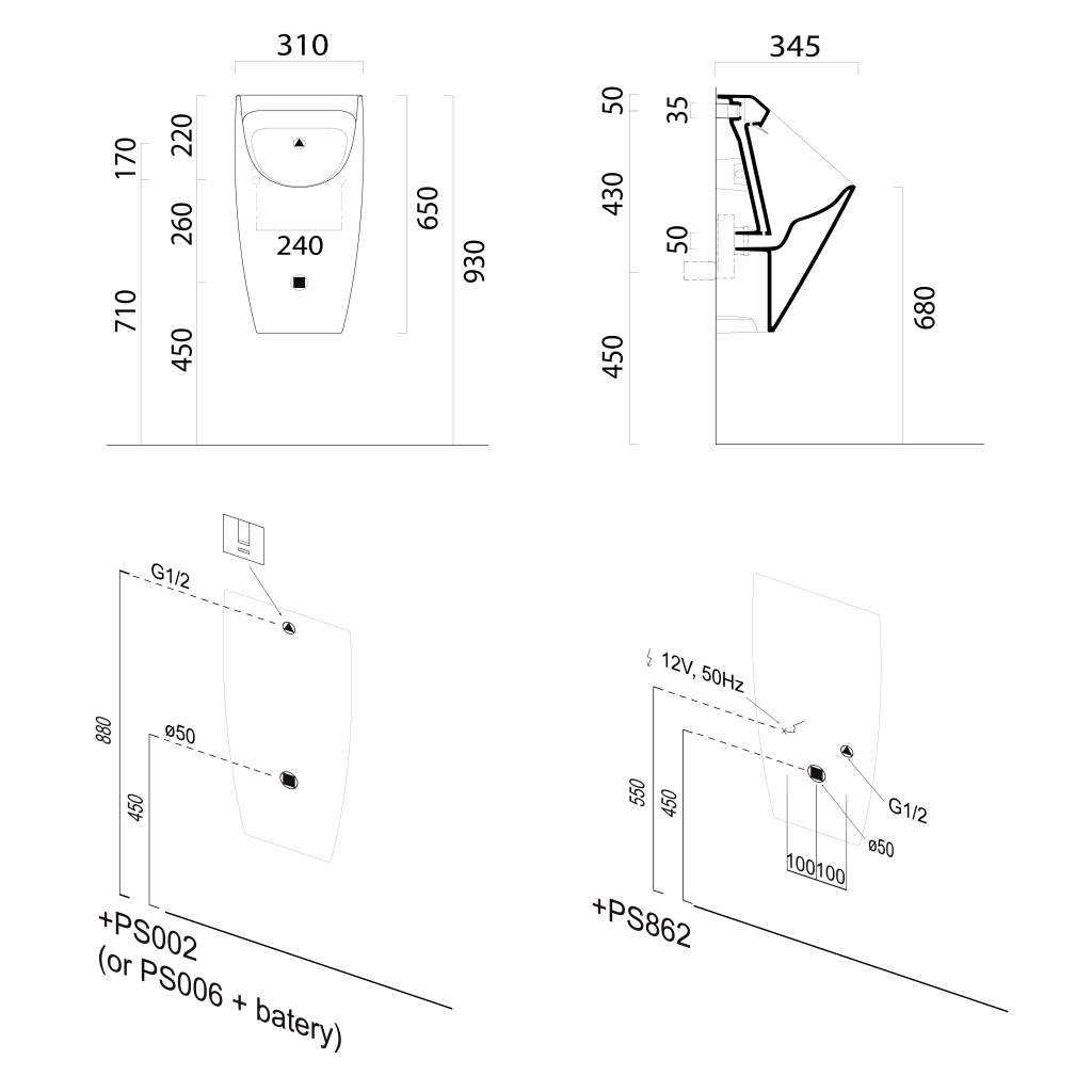 - Při instalaci s automatickým splachovačem PS002 je nutné instalovat i napájecí zdroj (PS05T nebo PS10T).