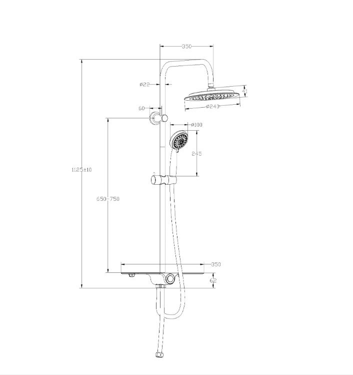 Vysoko kvalitný sprchový stĺp z nerezovej ocele výškou cca 112 cm. Veľkoformátový sprchový tanier s dažďovou sprchou s priemerom cca 24 cm.