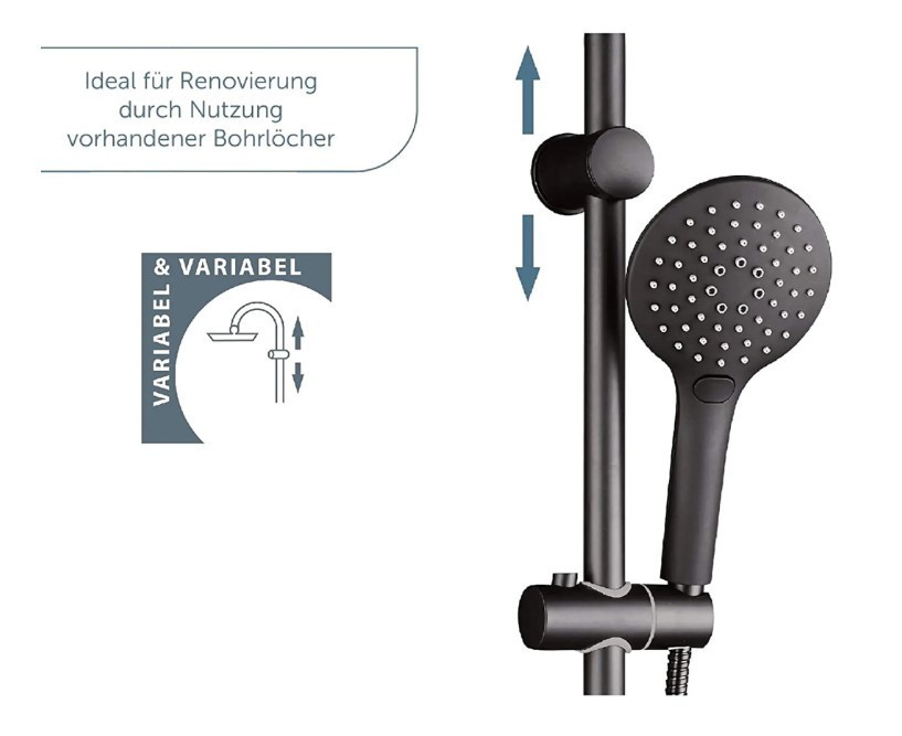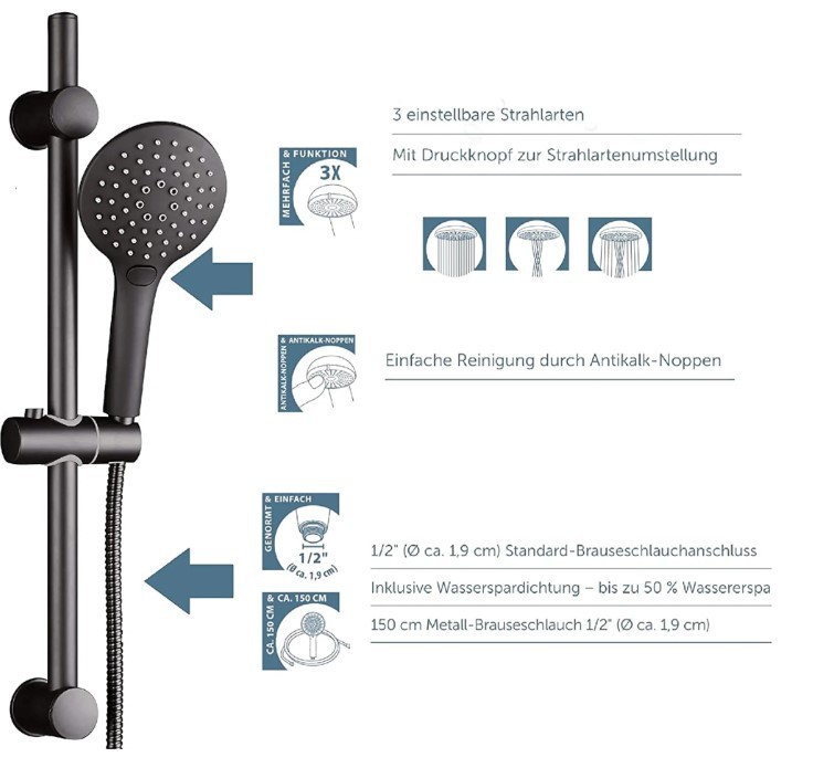 Úspora vody až o 50% a to vďaka samostatnému tesneniu na úsporu vody. Sprchová tyč s výškovo nastaviteľným nástenným držiakom na použitie do už vyvŕtaných otvorov. Pri rekonštrukcii nie je nutné robiť nové otvory.