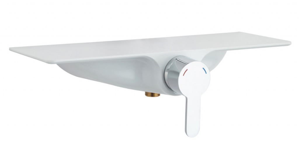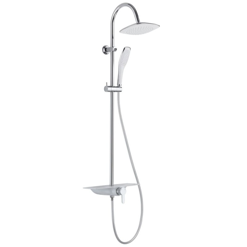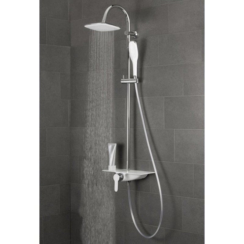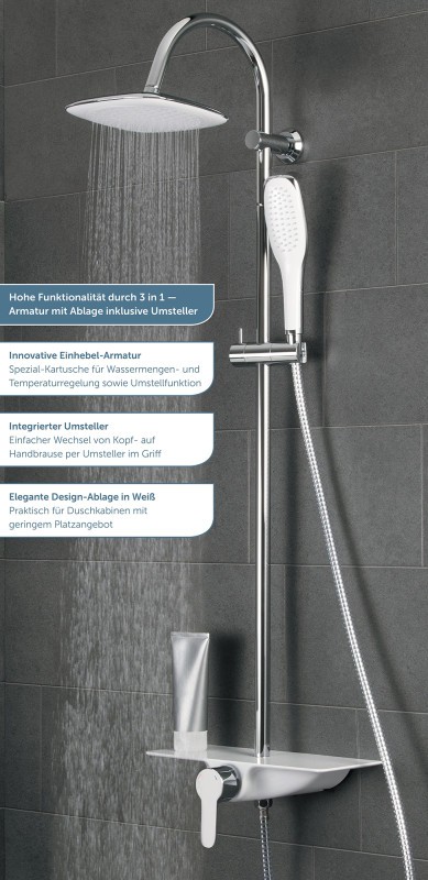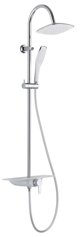 Súčasti sprchového setu je luxusná polička v elegantnej bielej farbe . Ktorá môže slúžiť napríklad na odloženie sprchového gélu alebo šampónu. Uprostred je tlačidlo, ktorým jednoducho prepínate prúd vody medzi hlavovou a ručnou sprchou.